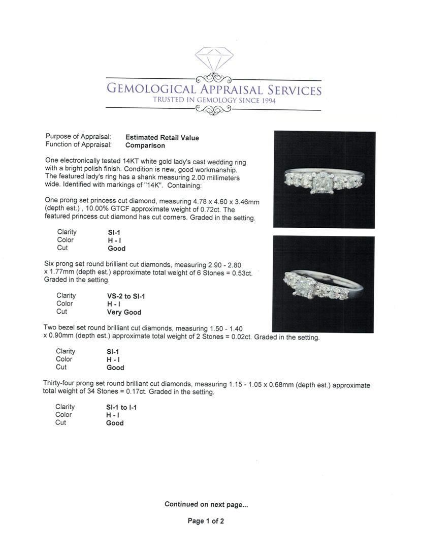 One electronically tested 14KT white gold lady's cast wedding ring with a bright polish finish. The featured lady's ring has a shank measuring 2.00 millimeters wide. Identified with markings of '14K'. Condition is new, good workmanship. Containing: One prong set princess cut diamond, measuring 4.78 x 4.60 x 3.46mm (depth est.) , 10.00.%. GTCF approximate weight of 0.72ct. The featured princess cut diamond has cut corners. Graded in the setting. Color H - I Clarity SI-1 Cut Good Six prong set round brilliant cut diamonds, measuring 2.90 - 2.80 x 1.77mm (depth est.) approximate total weight of 6 Stones = 0.53ct. Graded in the setting. Color H - I Clarity VS-2 to SI-1 Cut Very Good Two bezel set round brilliant cut diamonds, measuring 1.50 - 1.40 x 0.90mm (depth est.) approximate total weight of 2 Stones = 0.02ct. Graded in the setting. Color H - I Clarity SI-1 Cut Good Thirty-Four prong set round brilliant cut diamonds, measuring 1.15 - 1.05 x 0.68mm (depth est.) approximate total weight of 34 Stones = 0.17ct. Graded in the setting. Color H - I Clarity SI-1 to I-1 Cut Good. Total Weight of Diamonds 1.44ct.. Total Weight of Ring 3.40gm GAS Appraised.