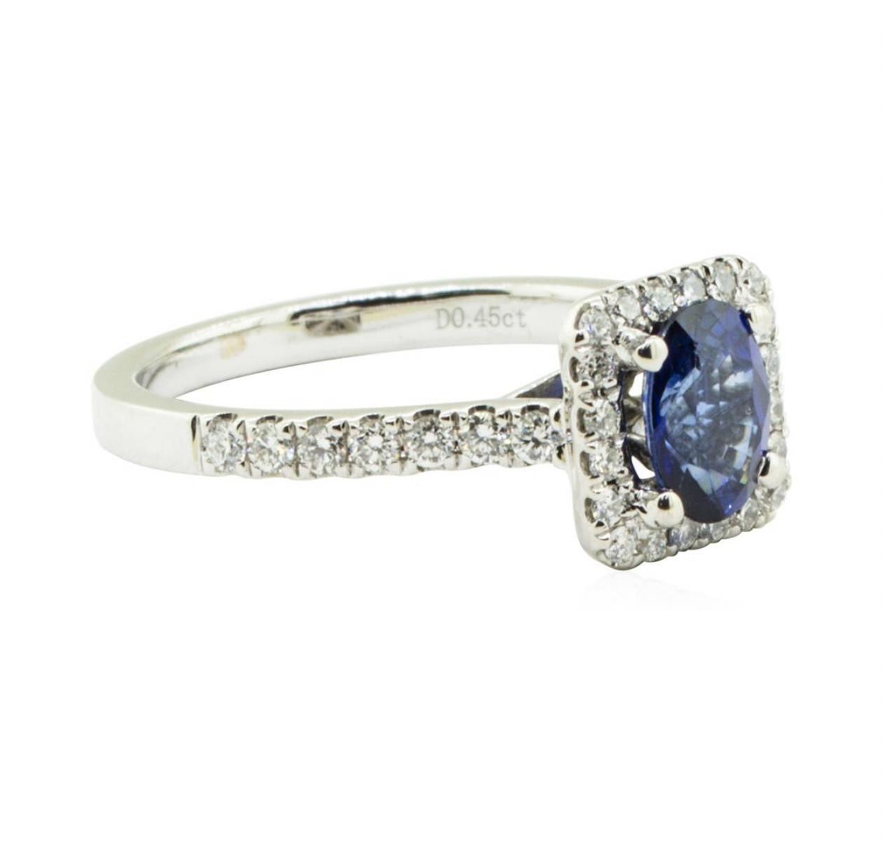 One electronically tested 18KT white gold lady's cast fashion ring with a straight line halo with a bright polish finish. The featured lady's ring has a shank measuring 2.00 millimeters in width. Identified with markings of '750'. Condition is new, good workmanship. Containing: One prong set oval modified brilliant cut natural blue sapphire, measuring 7.17 x 5.20 x 3.38mm, (depth est.) approximate weight of 1.03ct., clarity is eye clean, medium dark, moderately strong, blue color, (GIA B 6/4), cut is very good. Transmitting light with no distortion, transparent. Colored gemstones are presumed to have been subjected to commonly used enhancement processes. Graded in the setting. Fourteen prong set round brilliant cut diamonds, measuring 1.65 - 1.60 x 1.01mm (depth est.) approximate total weight of 14 Stones = 0.25ct. Graded in the setting. Color H - I Clarity SI-1 to SI-2 Cut Very Good Twenty prong set round brilliant cut diamonds, measuring 1.30 - 1.25 x 0.77mm (depth est.) approximate total weight of 20 Stones = 0.16ct. Graded in the setting. Color G - I Clarity VS-2 to SI-1 Cut Very Good. Total Weight of Colored Stones 1.03ct.. Total Weight of Diamonds 0.41ct.. Total Weight of Ring 3.80gm GAS Appraised at $3680.00. GAS Appraised.