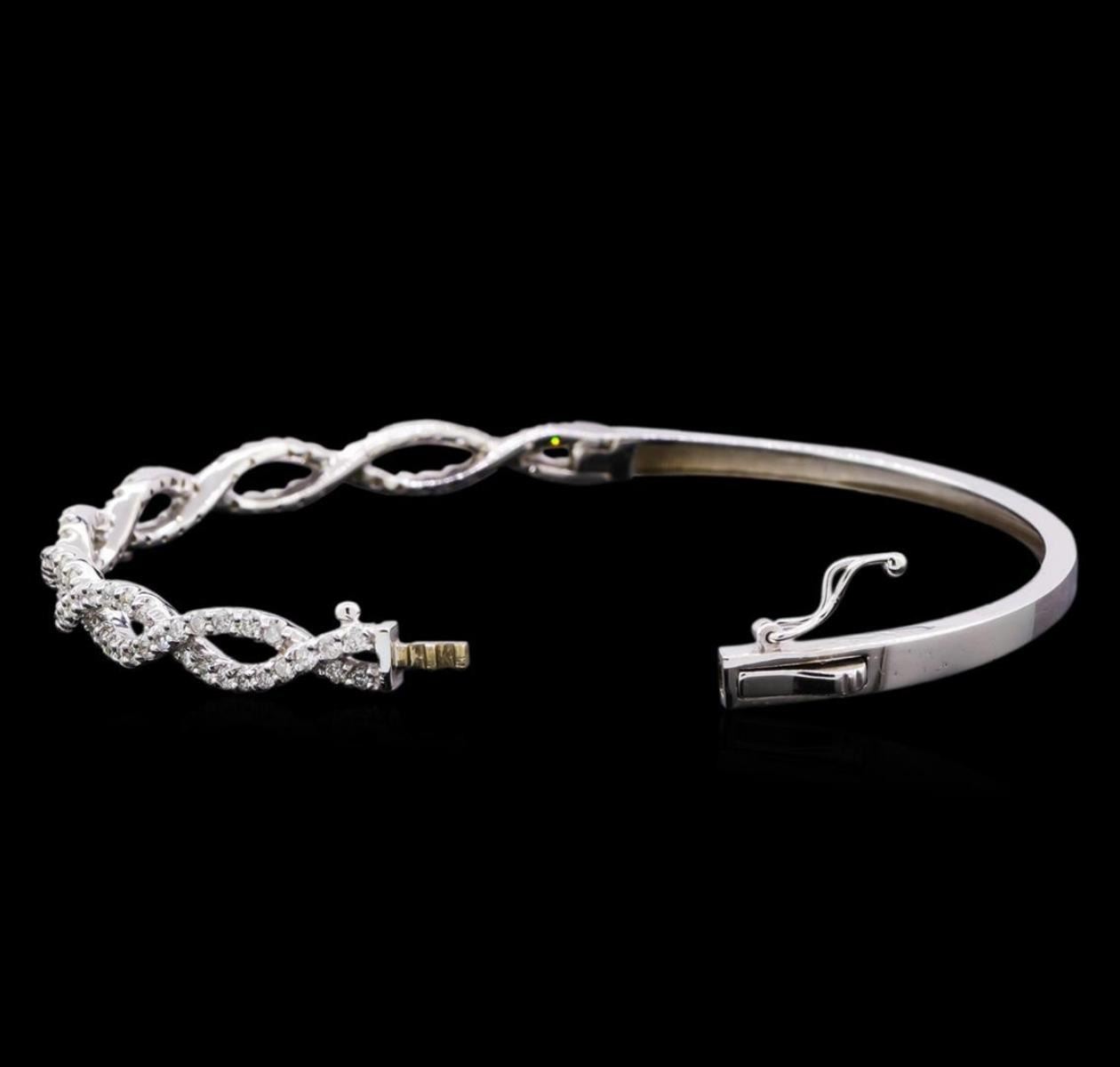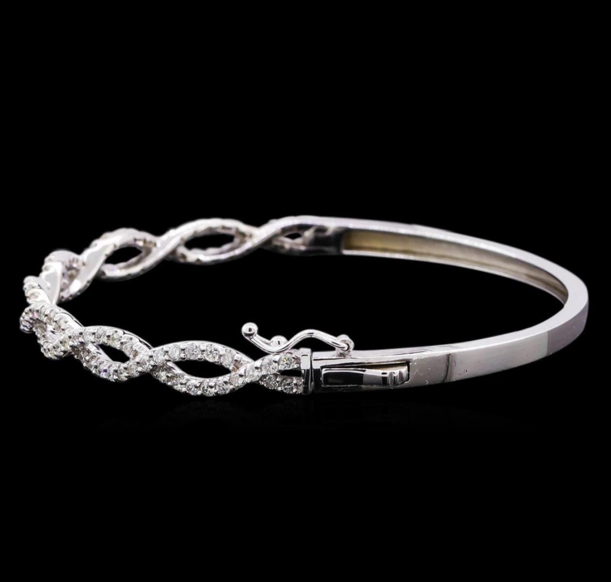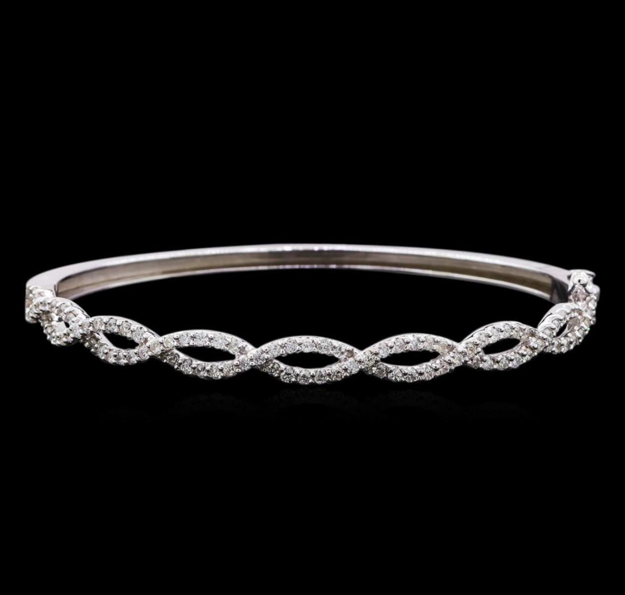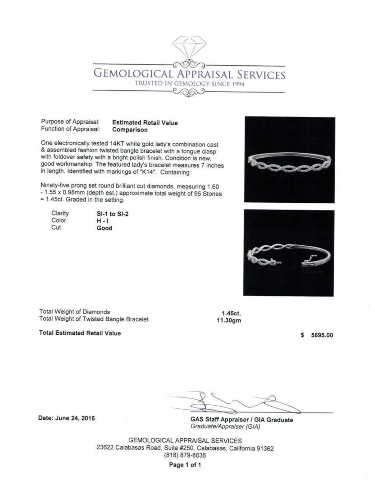 One electronically tested 14KT white gold lady's combination cast & assembled fashion twisted bangle bracelet with a tongue clasp with foldover safety with a bright polish finish. The featured lady's bracelet measures 7 inches in length. Identified with markings of "K14". Condition is new, good workmanship. Containing: Ninety-Five prong set round brilliant cut diamonds, measuring 1.60 - 1.55 x 0.98mm (depth est.) approximate total weight of 95 Stones = 1.45ct. Graded in the setting. Clarity: SI-1 to SI-2. Color: H - I. Cut Good. Total Weight of Diamonds 1.45ct. Total Weight of Twisted Bangle Bracelet 11.30gm. GAS Appraised.
