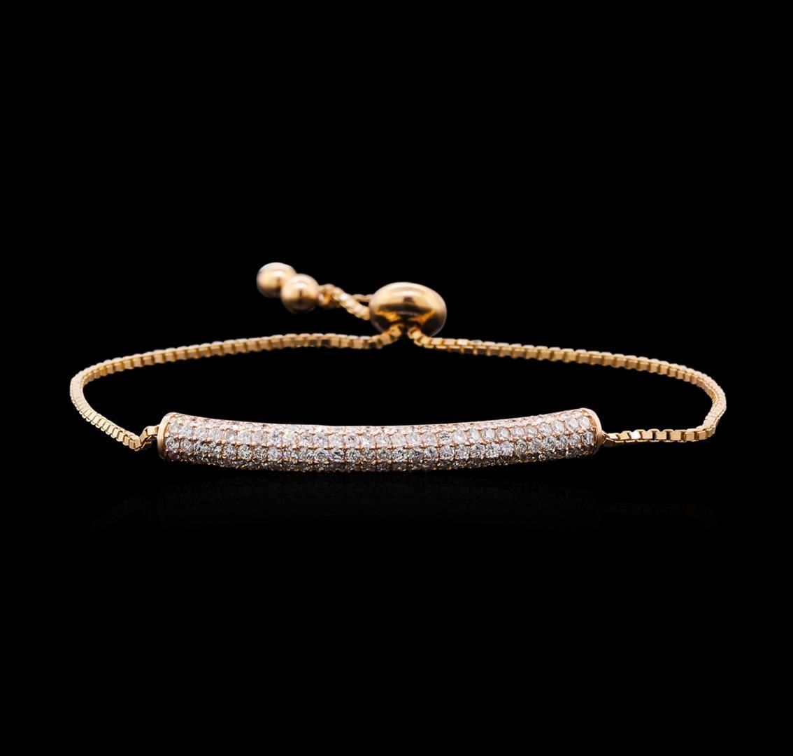 One electronically tested 14KT rose gold lady's combination cast & assembled fashion adjustable bracelet with a slide clasp with a bright polish finish. The featured lady's adjustable bracelet measures from 8.5 inches to 6 inches in length. Identified with markings of "K14". Condition is new, good workmanship. Containing: Eighty-Seven prong set round brilliant cut diamonds, measuring 1.45 - 1.40 x 0.89mm (depth est.) approximate total weight of 87 Stones = 0.97ct. Graded in the setting. Clarity: SI-1 to I-1. Color: H - I. Cut Good Fifty-Eight prong set round brilliant cut diamonds, measuring 1.30 - 1.20 x 0.78mm (depth est.) approximate total weight of 58 Stones = 0.48ct. Graded in the setting. Clarity: SI-1 to I-1. Color: H - I. Cut Good. Total Weight of Diamonds 1.45ct. Total Weight of Adjustable Bracelet 6.80gm. GAS Appraised.