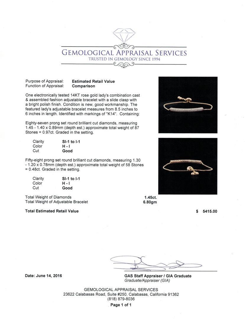 One electronically tested 14KT rose gold lady's combination cast & assembled fashion adjustable bracelet with a slide clasp with a bright polish finish. The featured lady's adjustable bracelet measures from 8.5 inches to 6 inches in length. Identified with markings of "K14". Condition is new, good workmanship. Containing: Eighty-Seven prong set round brilliant cut diamonds, measuring 1.45 - 1.40 x 0.89mm (depth est.) approximate total weight of 87 Stones = 0.97ct. Graded in the setting. Clarity: SI-1 to I-1. Color: H - I. Cut Good Fifty-Eight prong set round brilliant cut diamonds, measuring 1.30 - 1.20 x 0.78mm (depth est.) approximate total weight of 58 Stones = 0.48ct. Graded in the setting. Clarity: SI-1 to I-1. Color: H - I. Cut Good. Total Weight of Diamonds 1.45ct. Total Weight of Adjustable Bracelet 6.80gm. GAS Appraised.