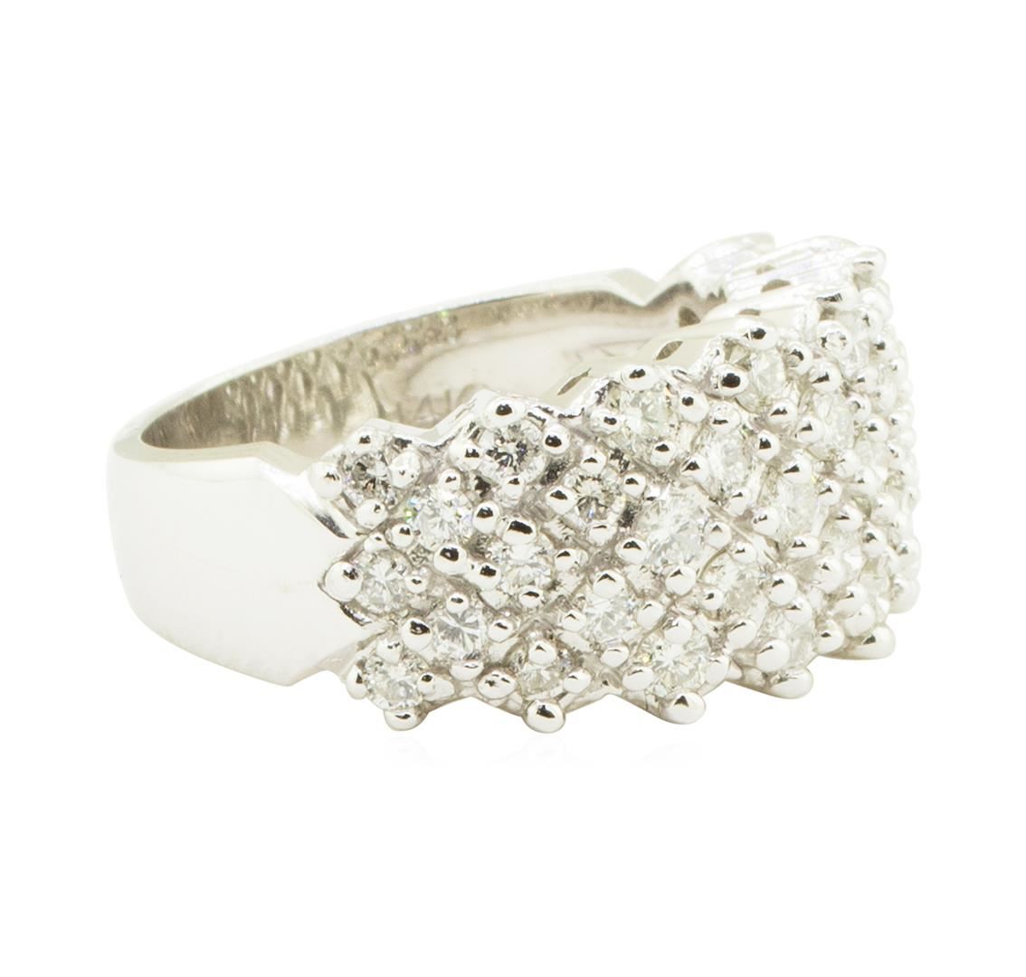 One electronically tested 14KT white gold lady's cast fashion wide band ring with a bright polish finish. The featured lady's ring has a shank measuring 4.50 millimeters in width. Identified with markings of '14K'. Condition is like new, good workmanship. Containing: Thirty-Eight prong set round brilliant cut diamonds, measuring 2.30 - 2.00 x 1.33mm (depth est.) approximate total weight of 38 Stones = 1.45ct. Graded in the setting. Color G - I Clarity VS-2 to SI-2 Cut Excellent. Total Weight of Diamonds 1.45ct.. Total Weight of Ring 8.80gm GAS Appraised at $5445.00. GAS Appraised.