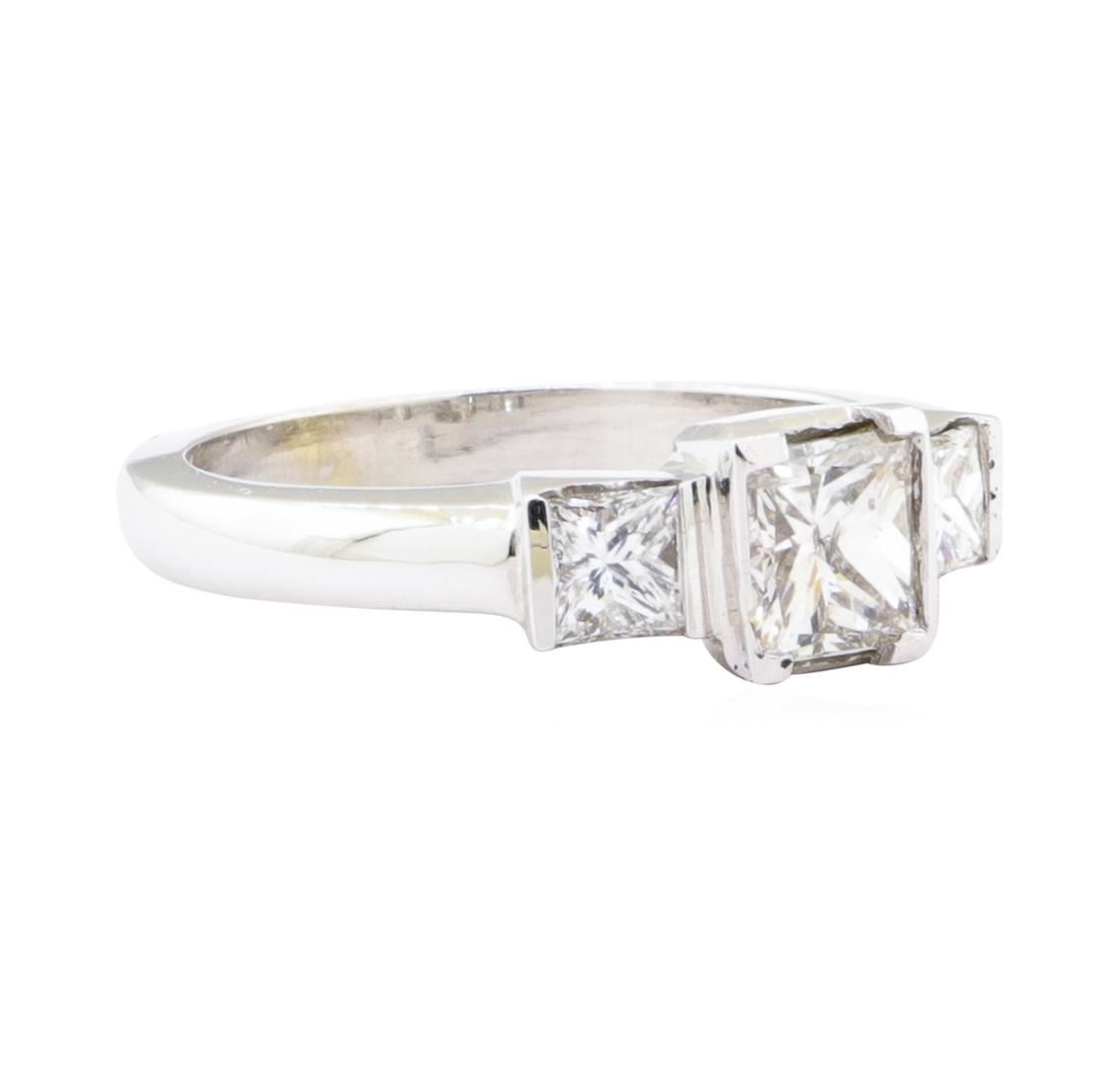 One electronically tested 14KT white gold lady's cast fashion ring with a three stone channel motif with a bright polish finish. The featured lady's ring has a shank measuring 2.30 millimeters wide. Identified with markings of '14K'. Condition is new, good workmanship. Containing: One channel set princess cut diamond, measuring 5.45 x 5.34 x 3.90mm (depth est.) approximate weight of 0.95ct. Graded in the setting. Color J Clarity I-1 Cut Very Good Two channel set princess cut diamonds, measuring 3.55 x 3.35 x 2.51mm (depth est.) approximate total weight of 2 Stones = 0.50ct. Graded in the setting. Color H - I Clarity VS-1 to VS-2 Cut Very Good. Total Weight of Diamonds 1.45ct.. Total Weight of Ring 5.00gm GAS Appraised at $7275.00. GAS Appraised.