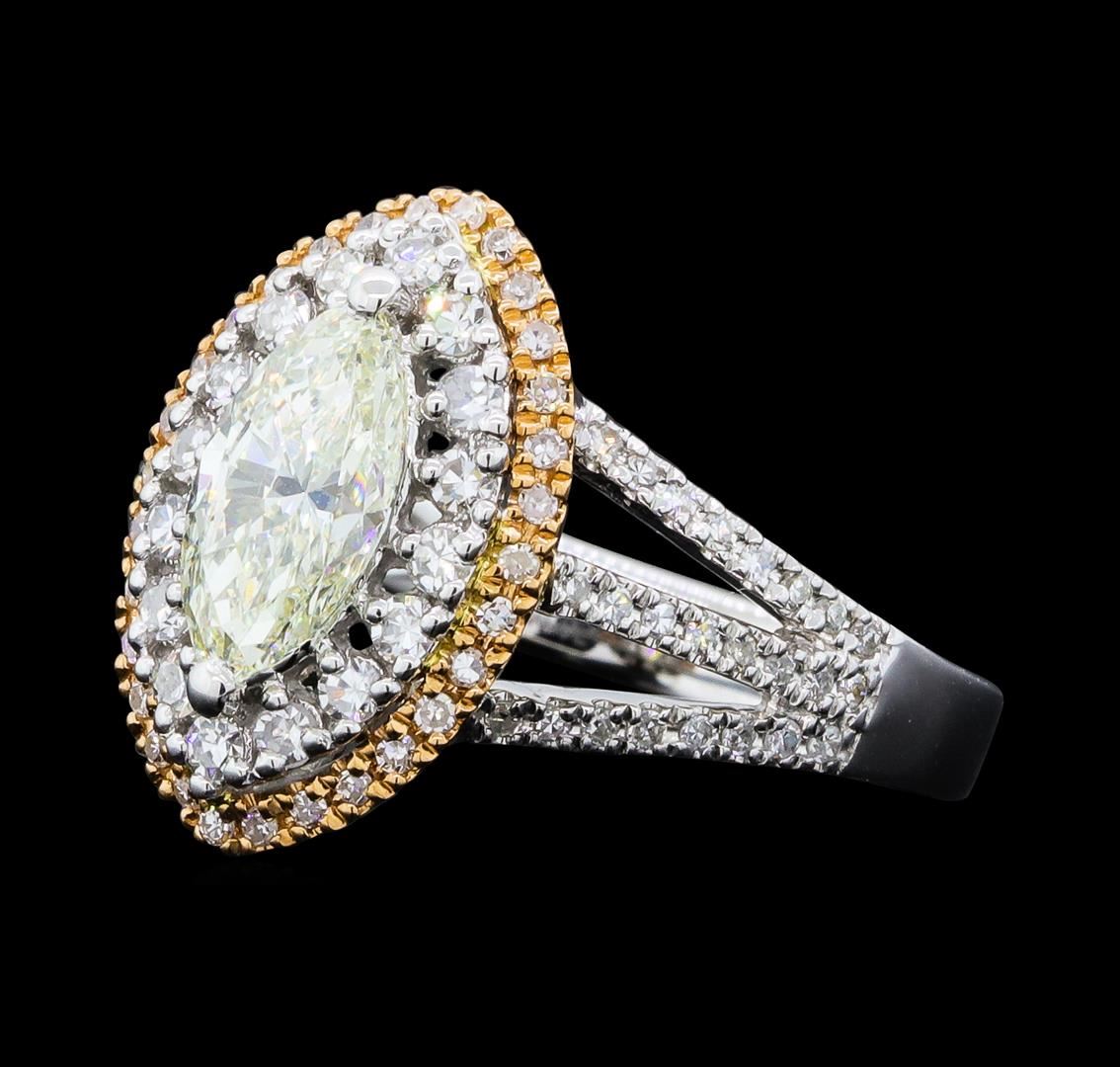 One electronically tested 18KT rose and white gold lady's combination cast & assembled wedding ring with a triple split shank basket halo with a bright polish finish. The featured lady's ring has a shank measuring 3.06 millimeters wide. Identified with markings of '18K 750'. Condition is new, good workmanship. Containing: One prong set marquise shaped cut diamond, measuring 9.77 x 5.16 x 3.52mm (depth est.) approximate weight of 1.02ct. Graded loose prior to setting in the GIA Laboratory, Report #6173494690. Color K Clarity SI-1 Cut Good Sixteen prong set single cut diamonds, measuring 1.50 - 1.40 x 0.90mm (depth est.) approximate total weight of 16 Stones = 0.18ct. Graded in the setting. Color G Clarity SI-1 to I-1 Cut Good Seventy-Eight prong set single cut diamonds, measuring 1.00 - 0.90 x 0.59mm (depth est.) approximate total weight of 78 Stones = 0.25ct. Graded in the setting. Color G - I Clarity SI-1 to I-1 Cut Good. Total Weight of Diamonds 1.45ct.. Total Weight of Ring 6.30gm GAS Appraised at $9855.00. GAS Appraised.
