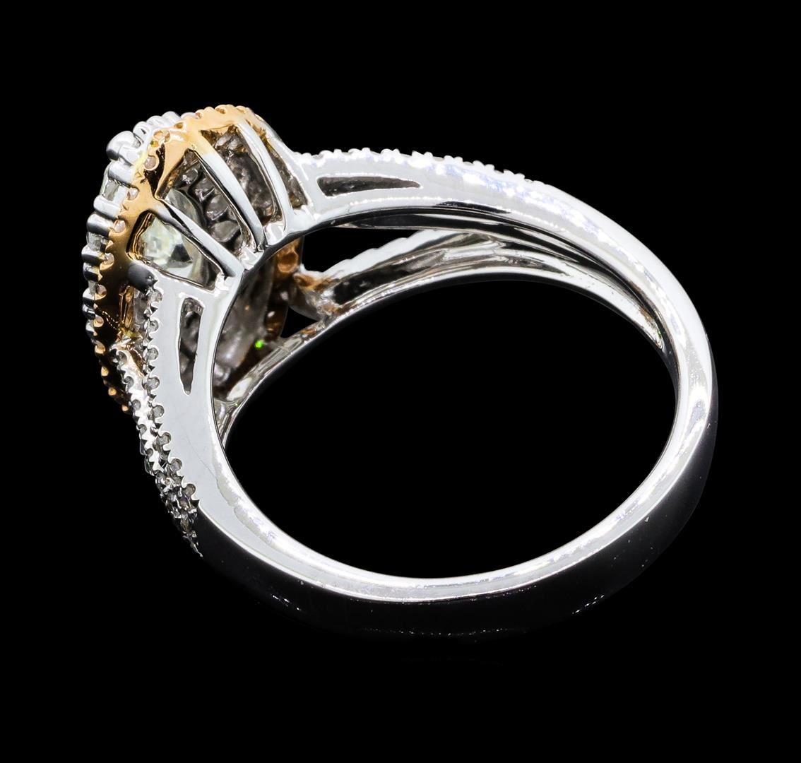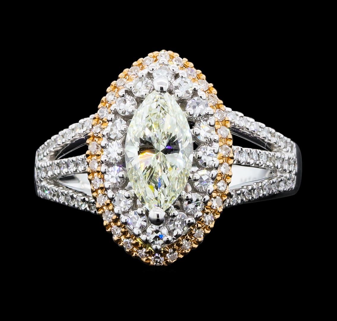 One electronically tested 18KT rose and white gold lady's combination cast & assembled wedding ring with a triple split shank basket halo with a bright polish finish. The featured lady's ring has a shank measuring 3.06 millimeters wide. Identified with markings of '18K 750'. Condition is new, good workmanship. Containing: One prong set marquise shaped cut diamond, measuring 9.77 x 5.16 x 3.52mm (depth est.) approximate weight of 1.02ct. Graded loose prior to setting in the GIA Laboratory, Report #6173494690. Color K Clarity SI-1 Cut Good Sixteen prong set single cut diamonds, measuring 1.50 - 1.40 x 0.90mm (depth est.) approximate total weight of 16 Stones = 0.18ct. Graded in the setting. Color G Clarity SI-1 to I-1 Cut Good Seventy-Eight prong set single cut diamonds, measuring 1.00 - 0.90 x 0.59mm (depth est.) approximate total weight of 78 Stones = 0.25ct. Graded in the setting. Color G - I Clarity SI-1 to I-1 Cut Good. Total Weight of Diamonds 1.45ct.. Total Weight of Ring 6.30gm GAS Appraised at $9855.00. GAS Appraised.