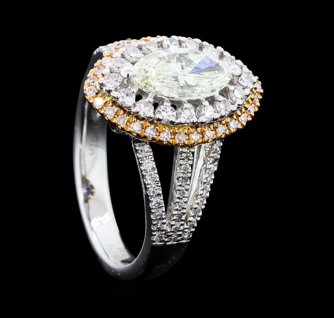 One electronically tested 18KT rose and white gold lady's combination cast & assembled wedding ring with a triple split shank basket halo with a bright polish finish. The featured lady's ring has a shank measuring 3.06 millimeters wide. Identified with markings of '18K 750'. Condition is new, good workmanship. Containing: One prong set marquise shaped cut diamond, measuring 9.77 x 5.16 x 3.52mm (depth est.) approximate weight of 1.02ct. Graded loose prior to setting in the GIA Laboratory, Report #6173494690. Color K Clarity SI-1 Cut Good Sixteen prong set single cut diamonds, measuring 1.50 - 1.40 x 0.90mm (depth est.) approximate total weight of 16 Stones = 0.18ct. Graded in the setting. Color G Clarity SI-1 to I-1 Cut Good Seventy-Eight prong set single cut diamonds, measuring 1.00 - 0.90 x 0.59mm (depth est.) approximate total weight of 78 Stones = 0.25ct. Graded in the setting. Color G - I Clarity SI-1 to I-1 Cut Good. Total Weight of Diamonds 1.45ct.. Total Weight of Ring 6.30gm GAS Appraised at $9855.00. GAS Appraised.