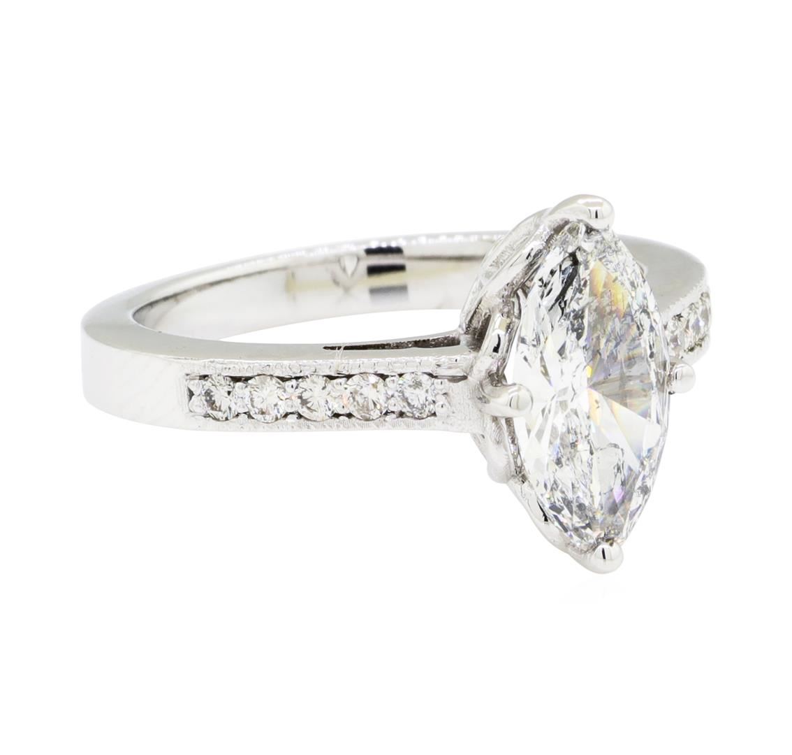One electronically tested 14KT white gold lady's cast straight line wedding ring with a cathedral shank with a bright polish with milgrain detailing finish. The featured lady's ring has a shank measuring 2.60 millimeters wide. Identified with markings of '14K'. Condition is new, good workmanship. Containing: One prong set marquise shaped cut diamond, measuring 11.26 x 5.94 x 2.86mm (depth est.) , 5.00.%. GTCF approximate weight of 1.27ct. Graded in the setting. Color H - I Clarity I-1 Cut Very Good Ten prong set round brilliant cut diamonds, measuring 1.80 - 1.70 x 1.05mm (depth est.) approximate total weight of 10 Stones = 0.19ct. Graded in the setting. Color H - I Clarity SI-1 to SI-2 Cut Very Good. Total Weight of Diamonds 1.46ct.. Total Weight of Ring 5.10gm GAS Appraised at $10740.00. GAS Appraised.