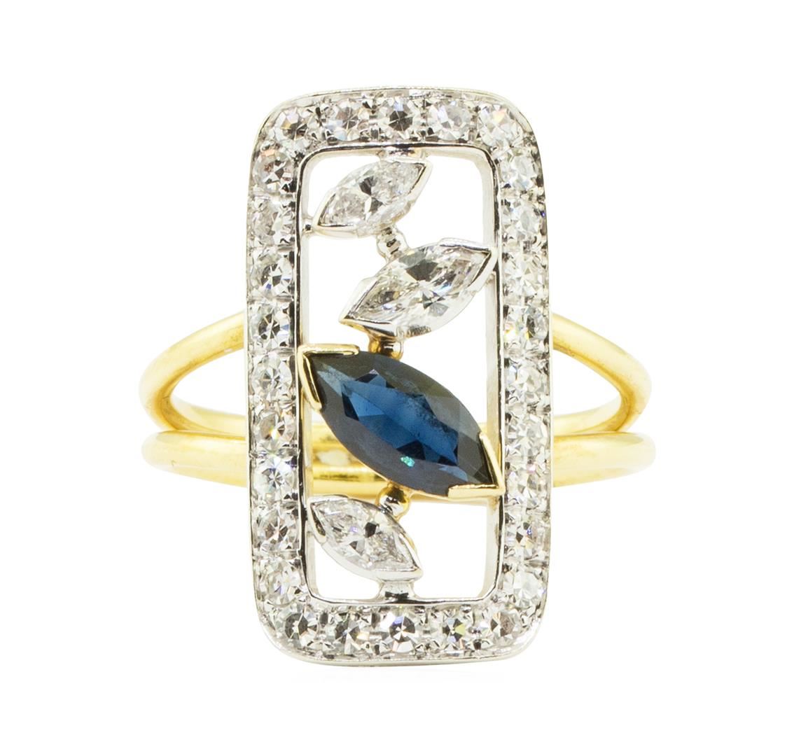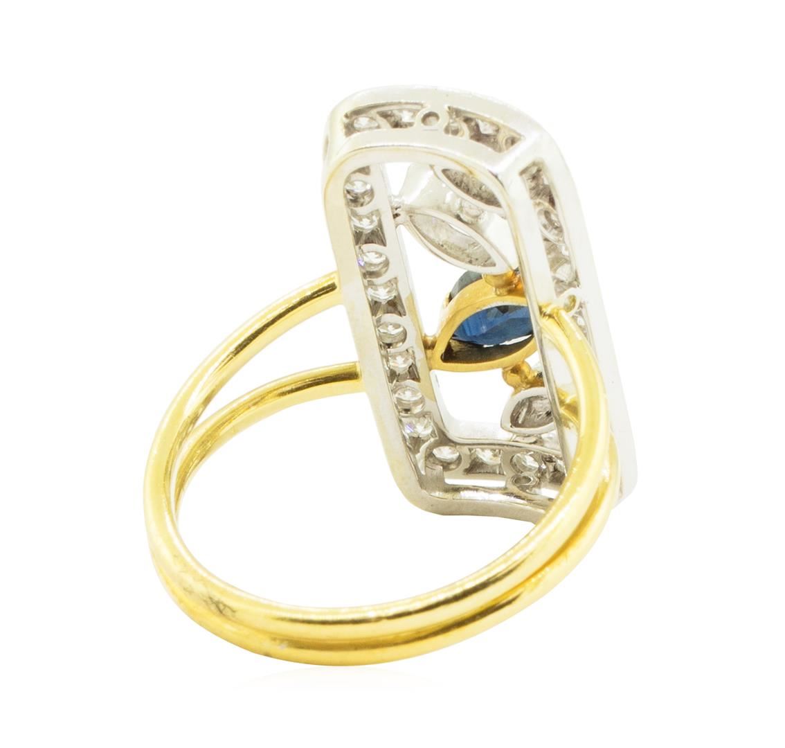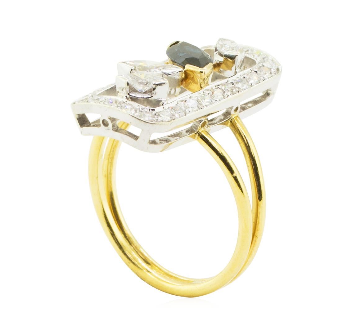 One electronically tested 14KT yellow and white gold lady's hand assembled fashion ring with a rectangular basket halo with a bright polish finish. The featured lady's ring has a double shank measuring 2.80 millimeters in width. Condition is like new, good workmanship. Containing: One prong set marquise modified brilliant cut natural blue sapphire, measuring 8.50 x 4.00 x 2.45mm, (depth est.) approximate weight of 0.63ct., clarity is slightly included, dark, very slightly grayish, blue color, (GIA B 7/3), cut is good. Transmitting light with a minimum of distortion, transparent. Colored gemstones are presumed to have been subjected to commonly used enhancement processes. Graded in the setting. Three prong set marquise shaped cut diamonds, measuring 5.90 x 2.30 x 1.45mm (depth est.) approximate total weight of 3 Stones = 0.35ct. Graded in the setting. Color H - I Clarity VS-2 to SI-1 Cut Very Good Twenty-Eight bead set single cut diamonds, measuring 1.70 - 1.60 x 0.99mm (depth est.) approximate total weight of 28 Stones = 0.48ct. Graded in the setting. Color F - G Clarity VS-1 to VS-2 Cut Very Good. Total Weight of Colored Stones 0.63ct.. Total Weight of Diamonds 0.83ct.. Total Weight of Ring 5.60gm GAS Appraised at $3600.00. GAS Appraised.
