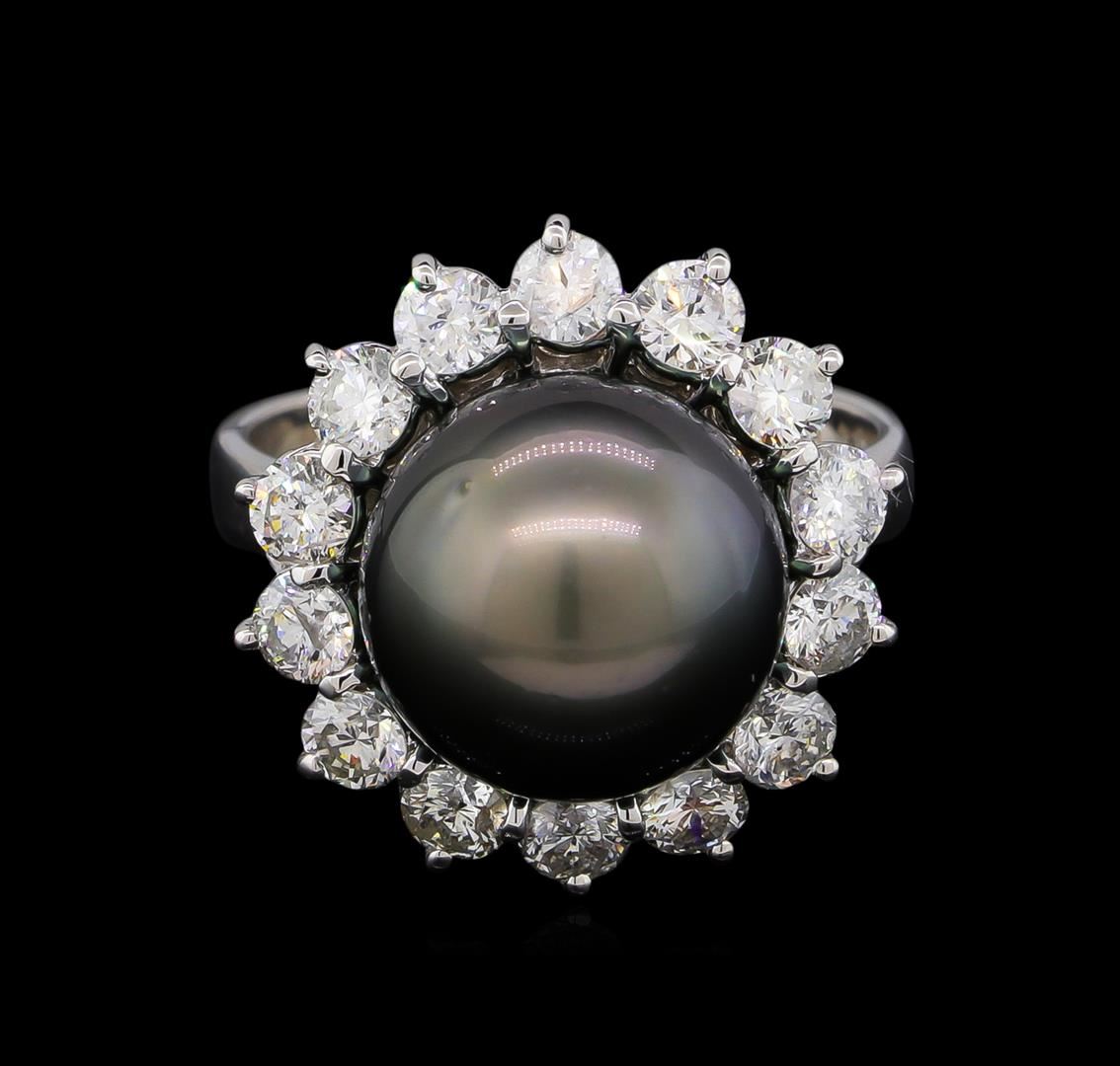 One electronically tested 14KT white gold lady's cast fashion ring with a basket halo with a bright polish finish. The featured lady's ring has a shank measuring 3.69 millimeters wide. Identified with markings of "K14". Condition is new, good workmanship. Containing: One Tahitian pearl, 11.4mm in size to 11.4mm in size. The pearl is black in color, green overtone with a very good luster, round, and mostly clean. Graded in the setting. Fourteen prong set round brilliant cut diamonds, measuring 3.10 - 3.00 x 1.83mm (depth est.) approximate total weight of 14 Stones = 1.46ct. Graded in the setting. Clarity: SI-1 to SI-2. Color: G - Very Good. Total Weight of Diamonds 1.46ct. Total Weight of Ring 7.40gm. GAS Appraised.