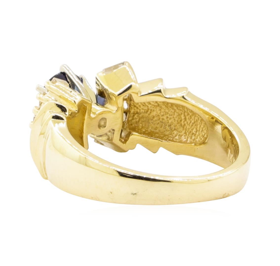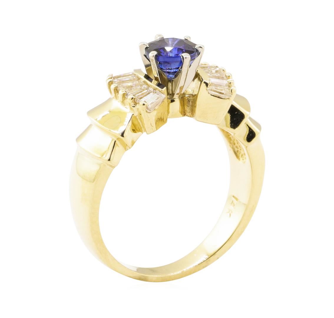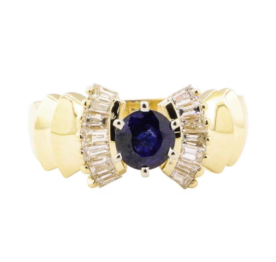 One electronically tested 14KT yellow gold lady's combination cast & assembled fashion ring with a bow motif with a bright polish finish. The featured lady's ring has a shank measuring 2.85 millimeters wide. Identified with markings of '14K'. Condition is new, good workmanship. Containing: One prong set round modified mixed cut natural blue sapphire, measuring 5.53 - 5.40 x 3.70 mm, (depth est.) approximate weight of 0.92ct., clarity is slightly included, medium dark, moderately strong, blue color, (GIA B 6/4), cut is good. Transmitting light with a minimum of distortion, transparent. Colored gemstones are presumed to have been subjected to commonly used enhancement processes. Graded in the setting. Fourteen channel and prong set baguette cut (tapered) diamonds, measuring from 2.60 x 1.30 x 1.11mm (depth est.) to 2.70 x 1.40 x 1.19mm (depth est.) approximate total weight of 14 Stones = 0.55ct. Graded in the setting. Color H - I Clarity VS-1 to VS-2 Cut Very Good. Total Weight of Colored Stones 0.92ct.. Total Weight of Diamonds 0.55ct.. Total Weight of Ring 6.70gm GAS Appraised at $3350.00. GAS Appraised.