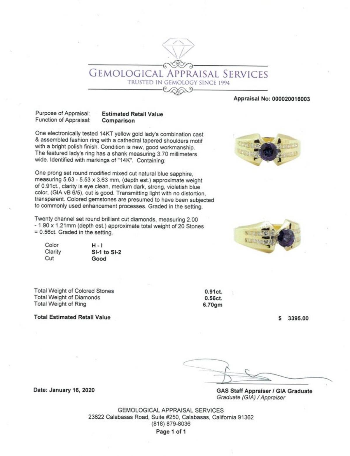 One electronically tested 14KT yellow gold lady's combination cast & assembled fashion ring with a cathedral tapered shoulders motif with a bright polish finish. The featured lady's ring has a shank measuring 3.70 millimeters wide. Identified with markings of '14K'. Condition is new, good workmanship. Containing: One prong set round modified mixed cut natural blue sapphire, measuring 5.63 - 5.53 x 3.63 mm, (depth est.) approximate weight of 0.91ct., clarity is eye clean, medium dark, strong, violetish blue color, (GIA vB 6/5), cut is good. Transmitting light with no distortion, transparent. Colored gemstones are presumed to have been subjected to commonly used enhancement processes. Graded in the setting. Twenty channel set round brilliant cut diamonds, measuring 2.00 - 1.90 x 1.21mm (depth est.) approximate total weight of 20 Stones = 0.56ct. Graded in the setting. Color H - I Clarity SI-1 to SI-2 Cut Good. Total Weight of Colored Stones 0.91ct.. Total Weight of Diamonds 0.56ct.. Total Weight of Ring 6.70gm GAS Appraised at $3395.00. GAS Appraised.