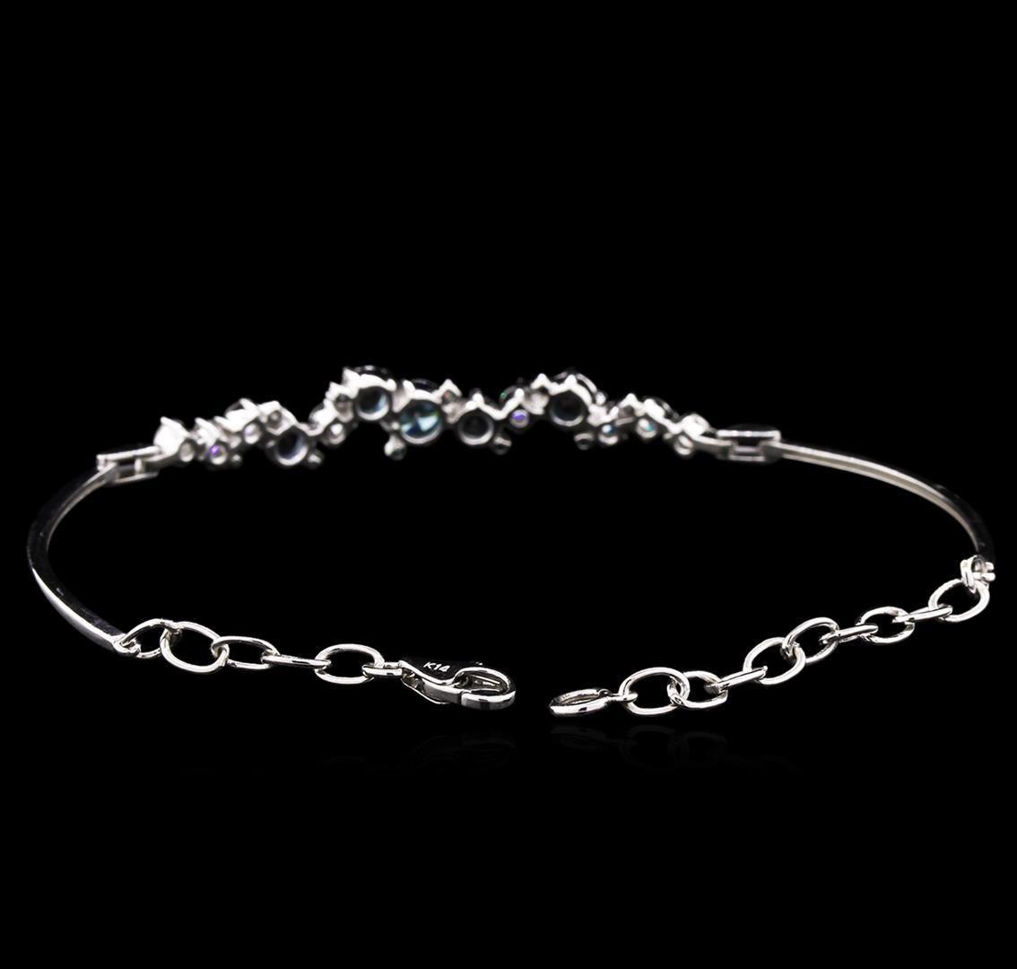 One electronically tested 14KT white gold lady's combination cast & assembled fashion bracelet with a lobster claw clasp with a bright polish finish. The featured ladies bracelet measures 7.00 inches in length. Identified with markings of "K14". Condition is new, good workmanship. Containing: Four prong set round standard brilliant cut natural blue sapphires, measuring 4.30 - 4.20 x 2.50 mm, approximate total weight of 1.48ct., clarity is slightly included, type II, medium light, very slightly grayish, blue color, (GIA B 4/3), cut is good. Colored gemstones are presumed to have been subjected to commonly used enhancement processes. Graded in the setting. One prong set round brilliant cut diamond, measuring 5.10 - 5.05 x 2.92mm (depth est.) approximate weight of 0.47ct. Graded in the setting. Clarity: I-1 Cut Good Five prong set round brilliant cut diamonds, measuring 1.70 - 1.60 x 0.99mm (depth est.) approximate total weight of 5 Stones = 0.08ct. Graded in the setting. Clarity: I-1 Cut Good Eight prong set round brilliant cut diamonds, measuring 3.10 - 3.00 x 1.83mm (depth est.) approximate total weight of 8 Stones = 0.83ct. Graded in the setting. Clarity: SI-1 to I-1. Color: G - I. Cut Good Five prong set round brilliant cut diamonds, measuring 1.30 - 1.20 x 0.81mm (depth est.) approximate total weight of 5 Stones = 0.04ct. Graded in the setting. Clarity: SI-2 to I-1. Color: H - I. Cut Good. Total Weight of Colored Stones 1.48ct. Total Weight of Diamonds 1.42ct. Total Weight of Bracelet 6.70gm. GAS Appraised.