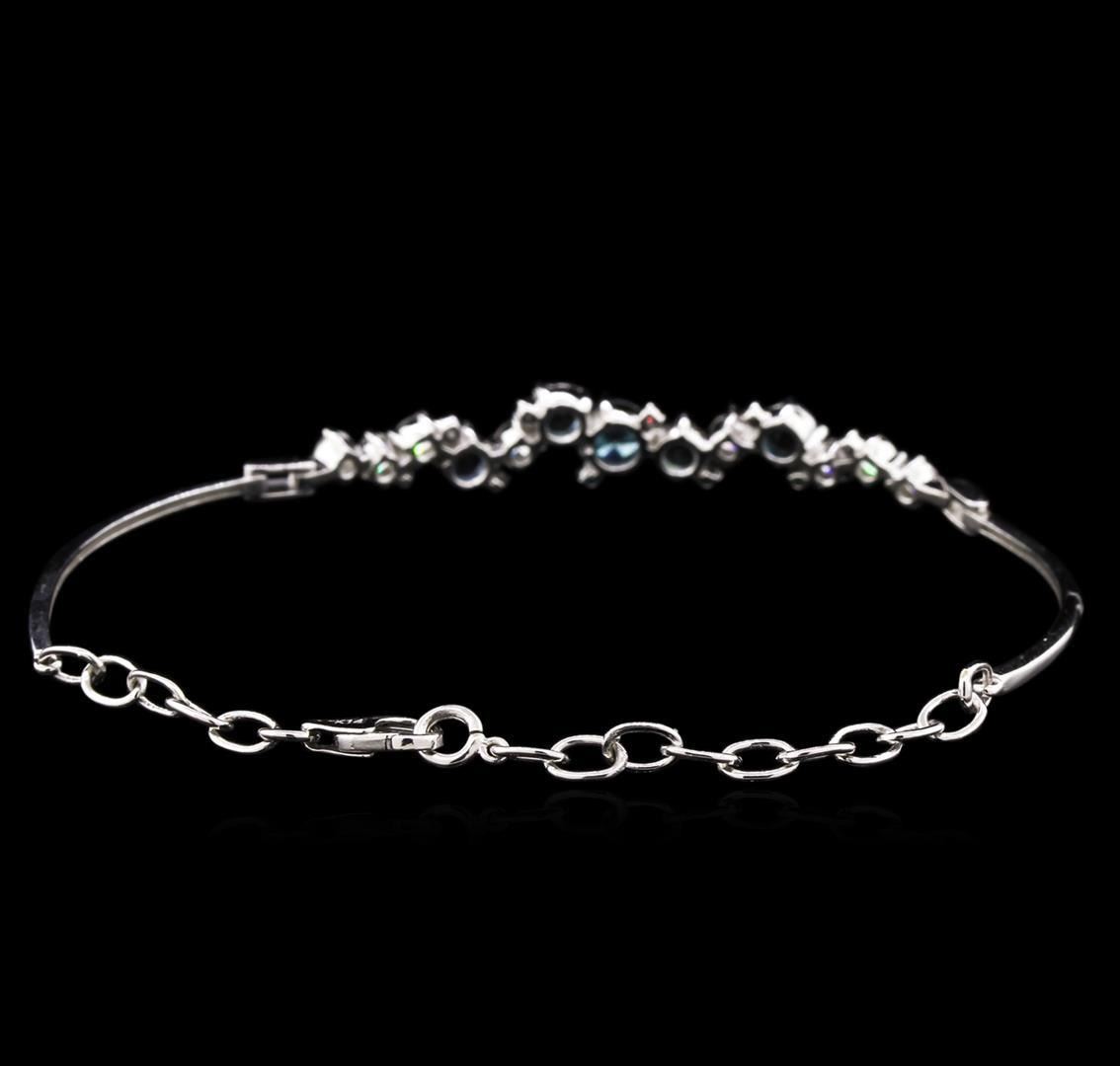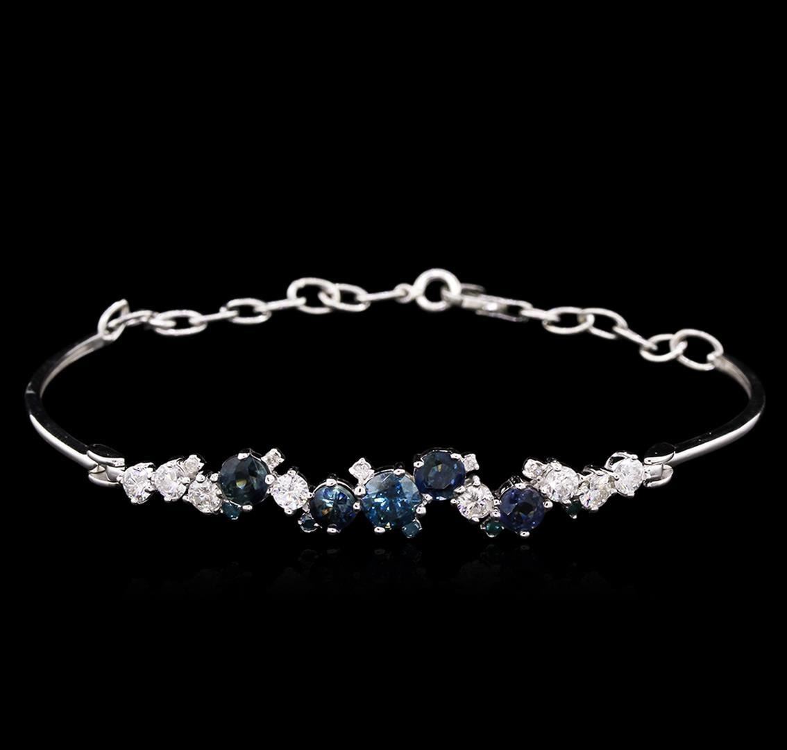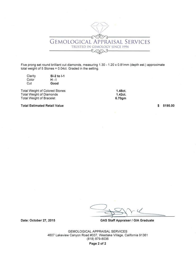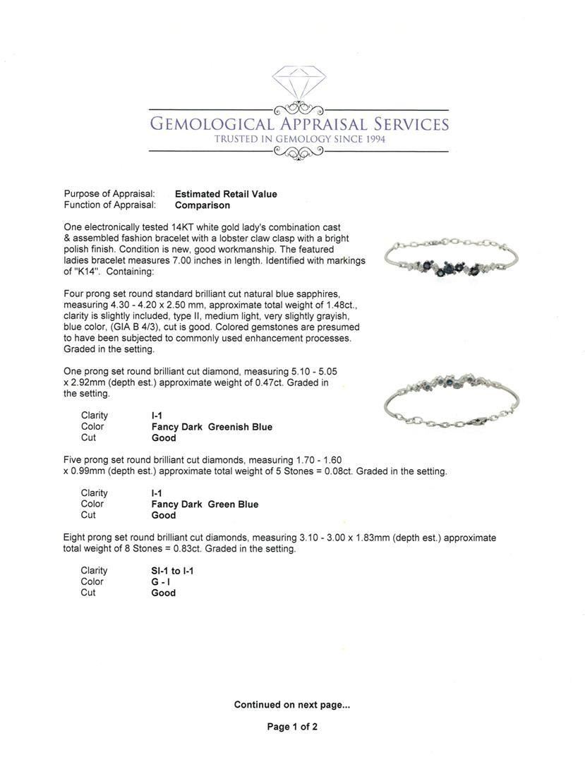 One electronically tested 14KT white gold lady's combination cast & assembled fashion bracelet with a lobster claw clasp with a bright polish finish. The featured ladies bracelet measures 7.00 inches in length. Identified with markings of "K14". Condition is new, good workmanship. Containing: Four prong set round standard brilliant cut natural blue sapphires, measuring 4.30 - 4.20 x 2.50 mm, approximate total weight of 1.48ct., clarity is slightly included, type II, medium light, very slightly grayish, blue color, (GIA B 4/3), cut is good. Colored gemstones are presumed to have been subjected to commonly used enhancement processes. Graded in the setting. One prong set round brilliant cut diamond, measuring 5.10 - 5.05 x 2.92mm (depth est.) approximate weight of 0.47ct. Graded in the setting. Clarity: I-1 Cut Good Five prong set round brilliant cut diamonds, measuring 1.70 - 1.60 x 0.99mm (depth est.) approximate total weight of 5 Stones = 0.08ct. Graded in the setting. Clarity: I-1 Cut Good Eight prong set round brilliant cut diamonds, measuring 3.10 - 3.00 x 1.83mm (depth est.) approximate total weight of 8 Stones = 0.83ct. Graded in the setting. Clarity: SI-1 to I-1. Color: G - I. Cut Good Five prong set round brilliant cut diamonds, measuring 1.30 - 1.20 x 0.81mm (depth est.) approximate total weight of 5 Stones = 0.04ct. Graded in the setting. Clarity: SI-2 to I-1. Color: H - I. Cut Good. Total Weight of Colored Stones 1.48ct. Total Weight of Diamonds 1.42ct. Total Weight of Bracelet 6.70gm. GAS Appraised.