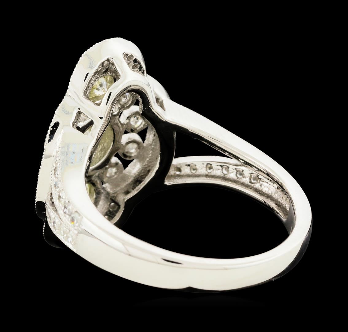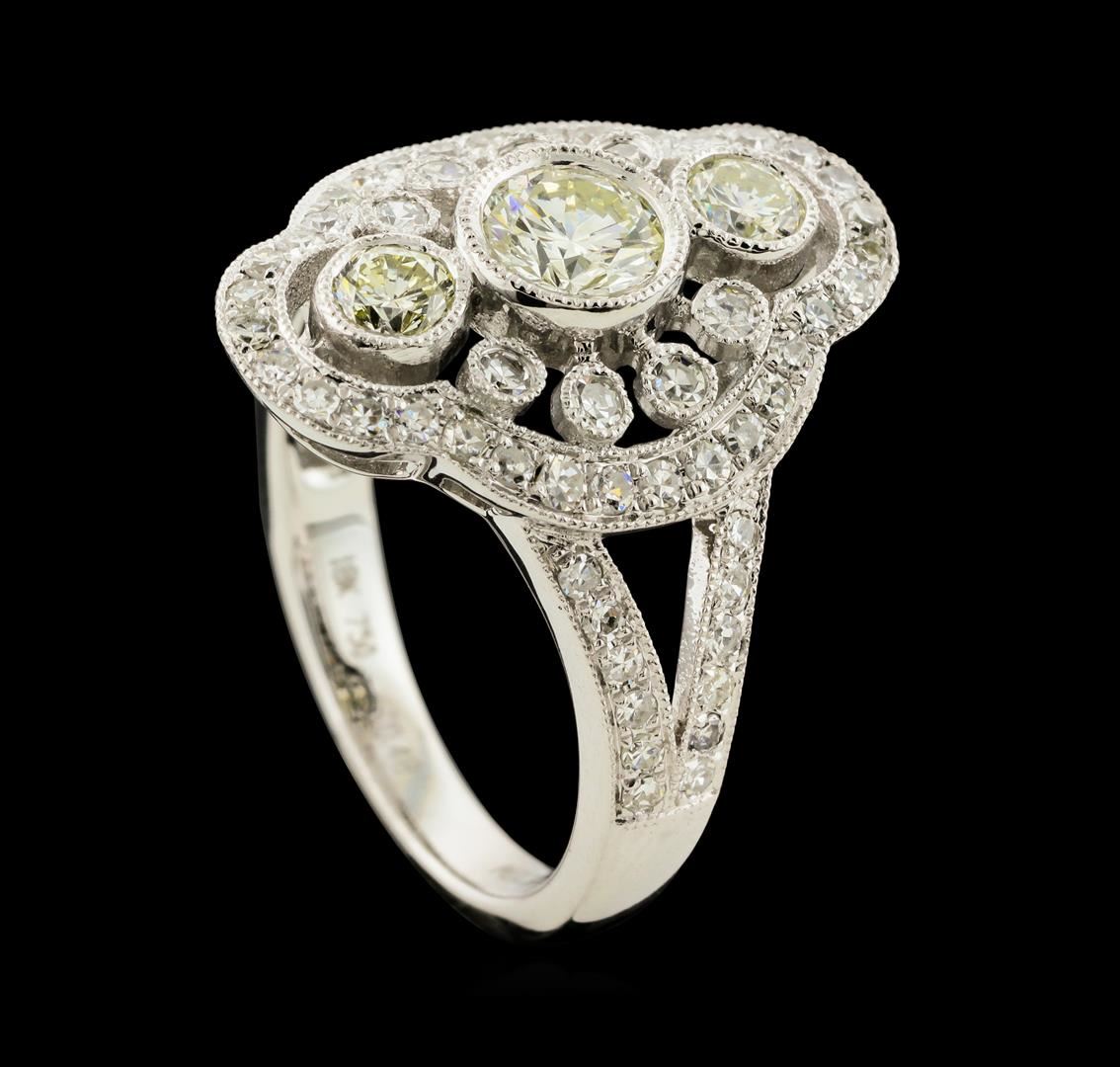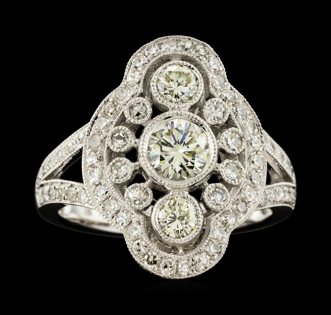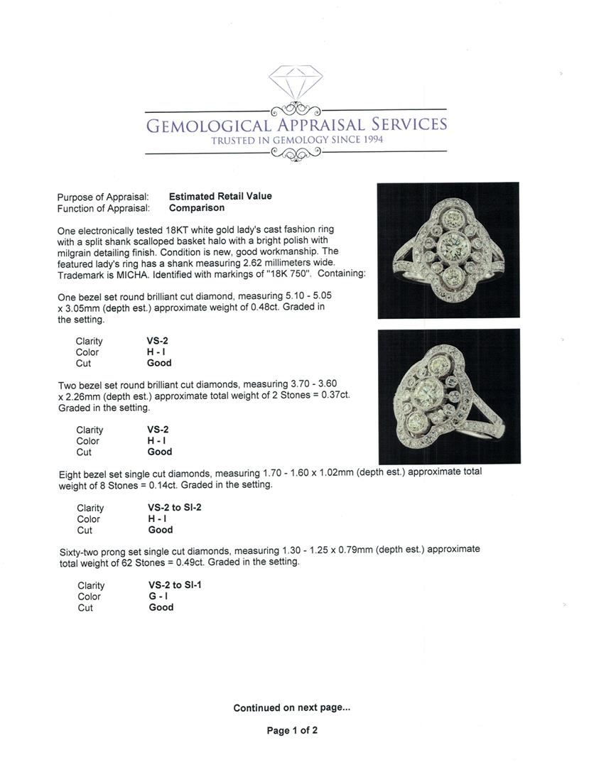 One electronically tested 18KT white gold lady's cast fashion ring with a split shank scalloped basket halo with a bright polish with milgrain detailing finish. The featured lady's ring has a shank measuring 2.62 millimeters wide. Trademark is MICHA. Identified with markings of '18K 750'. Condition is new, good workmanship. Containing: One bezel set round brilliant cut diamond, measuring 5.10 - 5.05 x 3.05mm (depth est.) approximate weight of 0.48ct. Graded in the setting. Clarity VS-2. Color: H - I Cut Good Two bezel set round brilliant cut diamonds, measuring 3.70 - 3.60 x 2.26mm (depth est.) approximate total weight of 2 Stones = 0.37ct. Graded in the setting. Clarity VS-2. Color: H - I Cut Good Eight bezel set single cut diamonds, measuring 1.70 - 1.60 x 1.02mm (depth est.) approximate total weight of 8 Stones = 0.14ct. Graded in the setting. Clarity VS-2 to SI-2. Color: H - I Cut Good Sixty-Two prong set single cut diamonds, measuring 1.30 - 1.25 x 0.79mm (depth est.) approximate total weight of 62 Stones = 0.49ct. Graded in the setting. Clarity VS-2 to SI-1. Color: G - I Cut Good. Total Weight of Diamonds 1.48ct.. Total Weight of Ring 6.70gm. GAS Appraised.