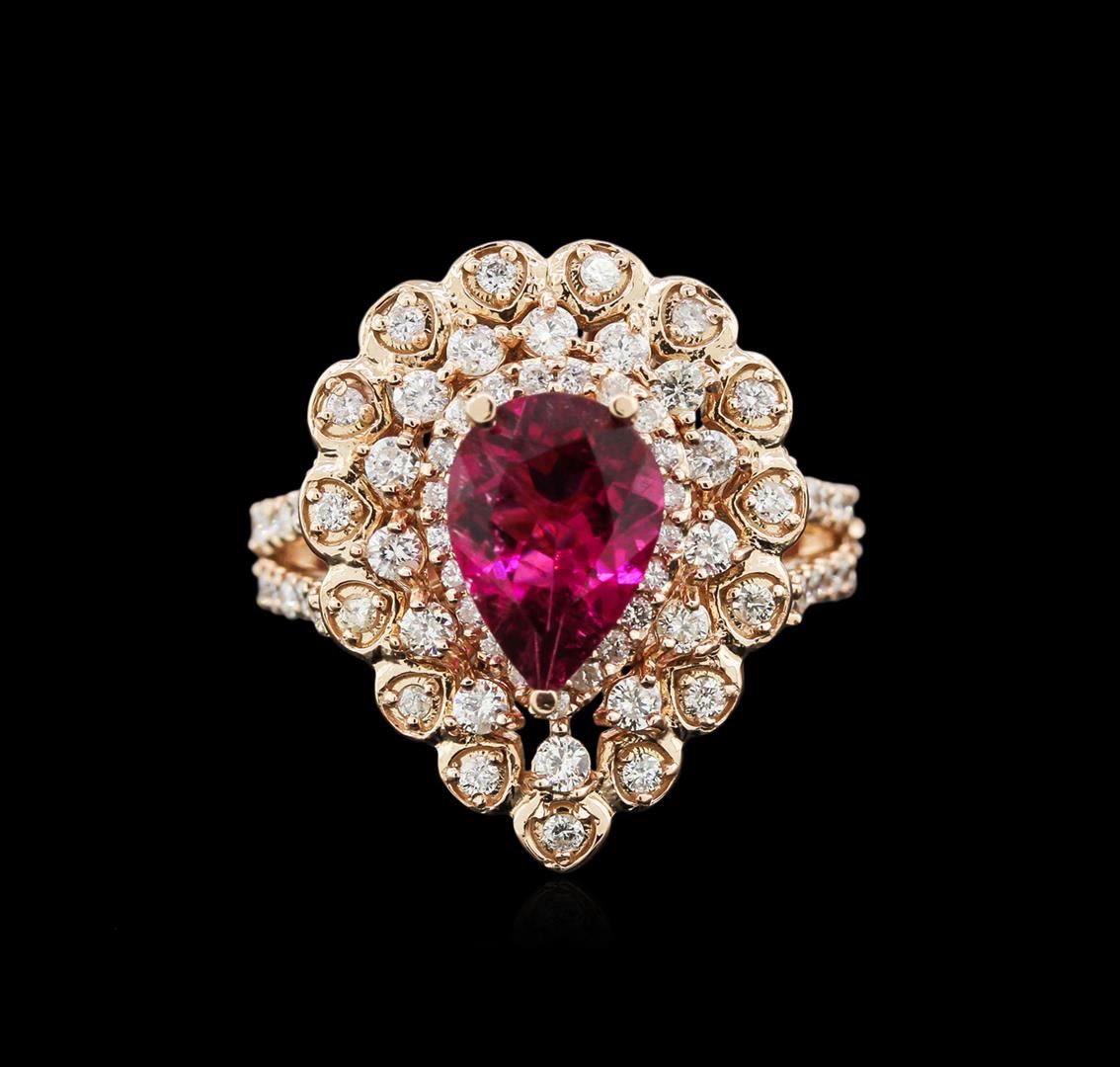 One electronically tested 14KT rose gold ladies cast rubellite tourmaline and diamond ring with a bright polish finish. The featured rubellite tourmaline is set within tiered diamond bezels supported by diamond set split shoulders, completed by a two and one-half millimeter wide band. Identified with markings of "K14". Condition is new, good workmanship. Containing: One prong set pear mixed cut natural rubellite approximate weight of 1.48ct., clarity is slightly included, type III, dark, very slightly brownish, strongly purplish red color, (GIA stpR 7/3), cut is good. Transmitting light with a minimum of distortion, transparent. Naturally occurring internal & external characteristics are present. Graded in the setting. Seventy-Four prong set round brilliant cut diamonds approximate total weight of 74 Stones = 0.83ct. Graded in the setting. Clarity I-1 to I-2 Color G - I. Total Weight of Colored Stones 1.48ct. Total Weight of Diamonds 0.83ct. Total Weight of Ring 7.13 grams. AIG Appraised.