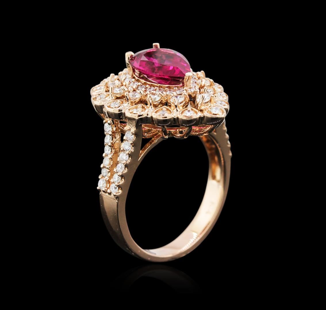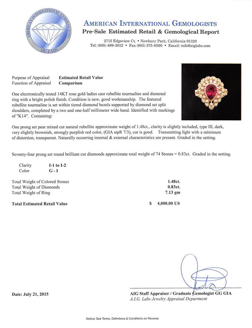 One electronically tested 14KT rose gold ladies cast rubellite tourmaline and diamond ring with a bright polish finish. The featured rubellite tourmaline is set within tiered diamond bezels supported by diamond set split shoulders, completed by a two and one-half millimeter wide band. Identified with markings of "K14". Condition is new, good workmanship. Containing: One prong set pear mixed cut natural rubellite approximate weight of 1.48ct., clarity is slightly included, type III, dark, very slightly brownish, strongly purplish red color, (GIA stpR 7/3), cut is good. Transmitting light with a minimum of distortion, transparent. Naturally occurring internal & external characteristics are present. Graded in the setting. Seventy-Four prong set round brilliant cut diamonds approximate total weight of 74 Stones = 0.83ct. Graded in the setting. Clarity I-1 to I-2 Color G - I. Total Weight of Colored Stones 1.48ct. Total Weight of Diamonds 0.83ct. Total Weight of Ring 7.13 grams. AIG Appraised.