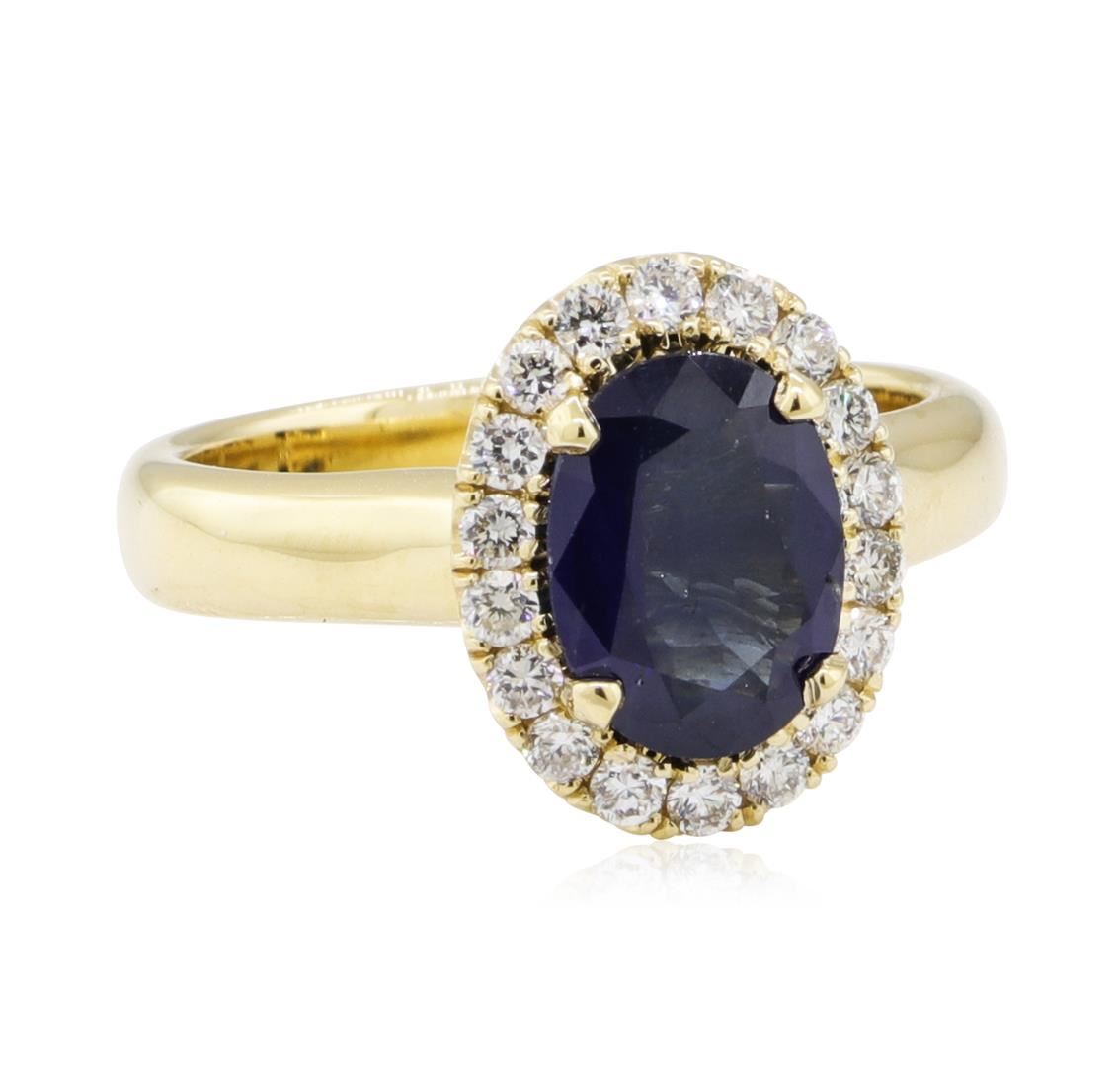 One electronically tested 14KT yellow gold lady's cast fashion ring with a half dome shank with a halo with a bright polish finish. The featured lady's ring has a shank measuring 3.15 millimeters wide. Identified with markings of '14K'. Condition is new, good workmanship. Containing: One prong set oval modified mixed cut natural blue sapphire, measuring 8.70 x 6.47 x 2.20mm, (depth est.) approximate weight of 1.03ct., clarity is moderately included, medium dark, moderately strong, blue color, (GIA B 6/4), cut is good. Transmitting light somewhat diffusely, transparent to translucent. Colored gemstones are presumed to have been subjected to commonly used enhancement processes. Graded in the setting. Eighteen prong set round brilliant cut diamonds, measuring 1.80 - 1.75 x 1.10mm (depth est.) approximate total weight of 18 Stones = 0.40ct. Graded in the setting. Color G - H Clarity VS-1 to VS-2 Cut Very Good Twelve prong set round brilliant cut diamonds, measuring 1.00 - 1.00 x 0.62mm (depth est.) approximate total weight of 12 Stones = 0.05ct. Graded in the setting. Color G - H Clarity VS-2 to SI-1 Cut Very Good. Total Weight of Colored Stones 1.03ct.. Total Weight of Diamonds 0.45ct.. Total Weight of Ring 5.10gm GAS Appraised at $2420.00. GAS Appraised.