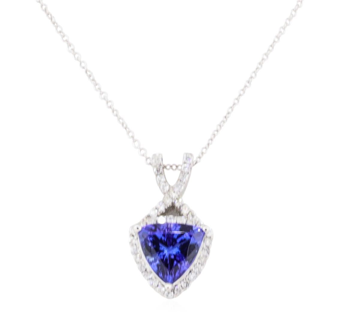 One electronically tested 14KT white gold ladies cast & assembled tanzanite & diamond pendant with chain. The featured tanzanite is set within a diamond bezel with diamond crossing ribbons, completed by a hidden bail. The pendant is supported by an eighteen inch length 14KT white gold link chain, terminating in a spring ring clasp. Bright polish finish. Trademark is Orianne. Identified with markings of "14K". Condition is new, good workmanship. Containing: One prong set triangle mixed cut natural tanzanite, measuring 7.50 x 7.60 x 4.80mm, exact weight 1.48ct., clarity is eye clean, type I, medium dark, very slightly grayish, violetish blue color, (GIA vB 6/3), cut is good. Transmitting light with a minimum of distortion, transparent. Graded in the setting. Tanzanite is a very rare gemstone that is only found in the country of Tanzania. Originally discovered in 1967. Tiffany & Company, named the stone Tanzanite. It is found in the Usumburu Mountains that border the Umba Valley of northern Tanzania. Tanzanite occurs in gray, brown, violet, blue, reddish-purple, & green. The gem is interesting because of its exceptional pleochroism. Rotated in different directions a tanzanite will exhibit multiple changes of color. Tanzanite has a low tolerance to ultrasonic cleaning, and should not be cleaned using this method. Thirty-Nine prong set round brilliant cut diamonds exact total weight 39 Stones = 0.20ct. The clarity & color grade reflect the overall average for the group. Graded in the setting. Clarity SI-2 to I-2 Color F - H Total Weight of Colored Stones 1.48 ct. Total Weight of Diamonds 0.20 ct. Total Weight of Pendant With Chain 2.60 gm Estimated Retail Value $ 4,375.00 US