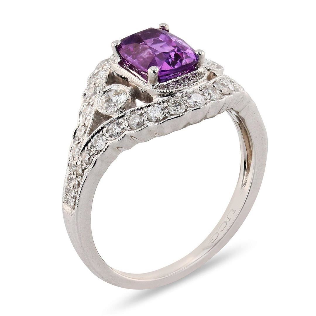 One electronically tested 18KT white gold ladies cast pink sapphire and diamond ring. Condition is new, good workmanship. The featured pink sapphire is set within mirroring stylized diamond set shoulders, completed by a one and one half millimeter wide ba