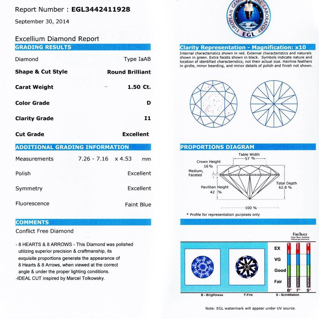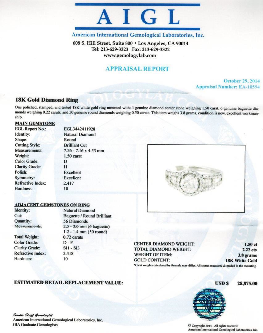 One polished, stamped and tested 18K white gold ring mounted with: 1 genuine diamond center stone weighing 1.50 carat, 6 genuine baguette diamonds weighing 0.22 carats and 50 genuine round diamonds weighing 0.50 carats. This item weighs 3.8 grams, condition is new, excellent workman-ship. MAIN GEMSTONE EGL Report No.: EGL3442411928 Identity: Natural Diamond Shape: Round Cutting Style: Brilliant Cut Measurements: 7.26 - 7.16 x 4.53 mm Weight: 1.50 carat Color Grade: D Clarity Grade: I1 Polish: Excellent Symmetry: Excellent Refractive Index: 2.417 Hardness: 10 ADJACENT GEMSTONES ON RING Identity: Natural Diamond Cut: Baguette / Round Brilliant Quantity: 56 Diamonds Measurements: 2.5 - 3.0 mm (6 baguette) 1.2 - 1.4 mm (50 round) Total Weight: 0.72 carats Color Grade: D - F Clarity Grade: SI1 - SI3 Refractive Index: 2.418 Hardness: 10 CENTER DIAMOND WEIGHT: 1.50ct TOTAL DIAMOND WEIGHT: 2.22ctw WEIGHT OF ITEM: 3.8 grams GOLD CONTENT: 18K White Gold #LREF-12833