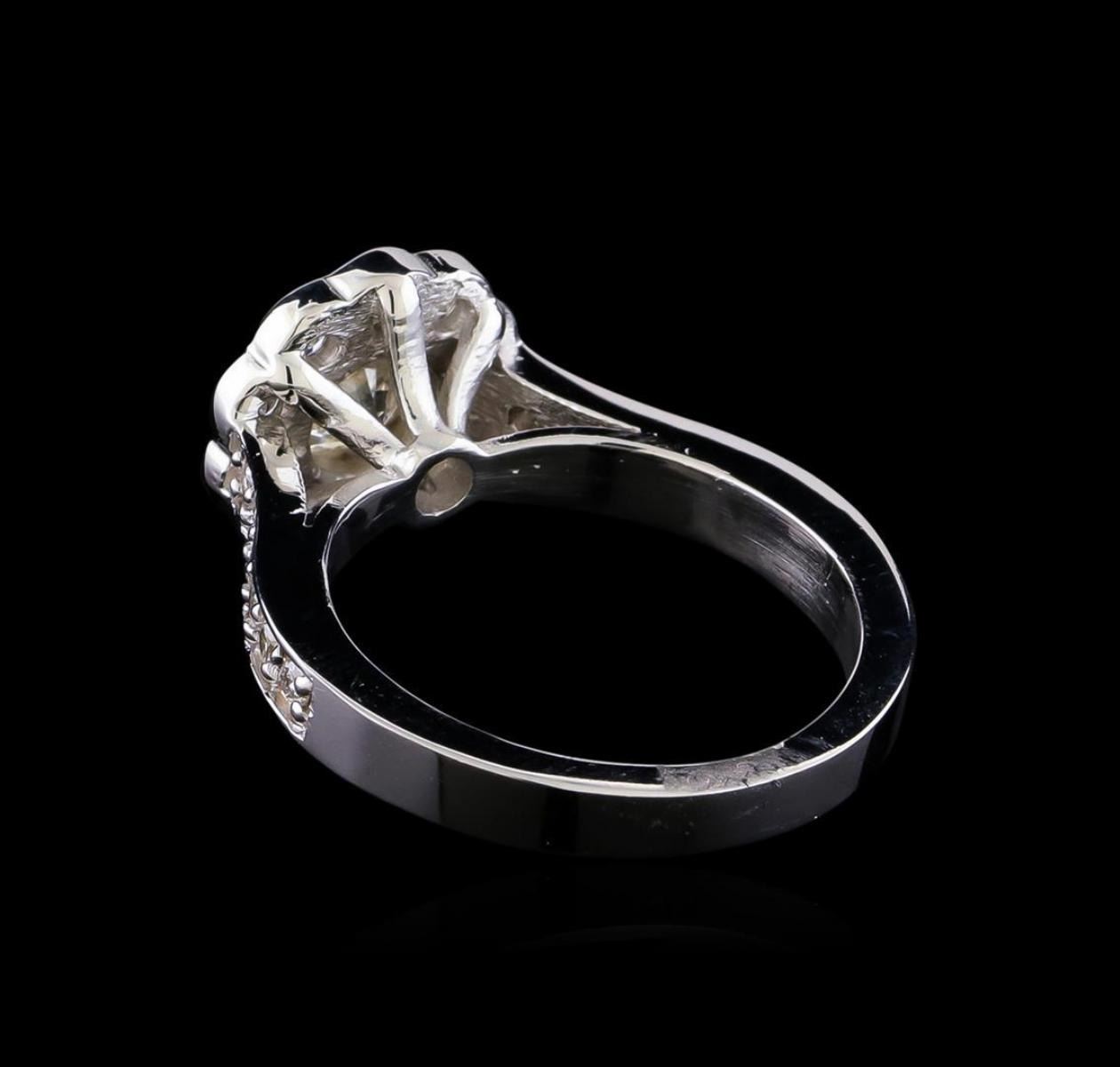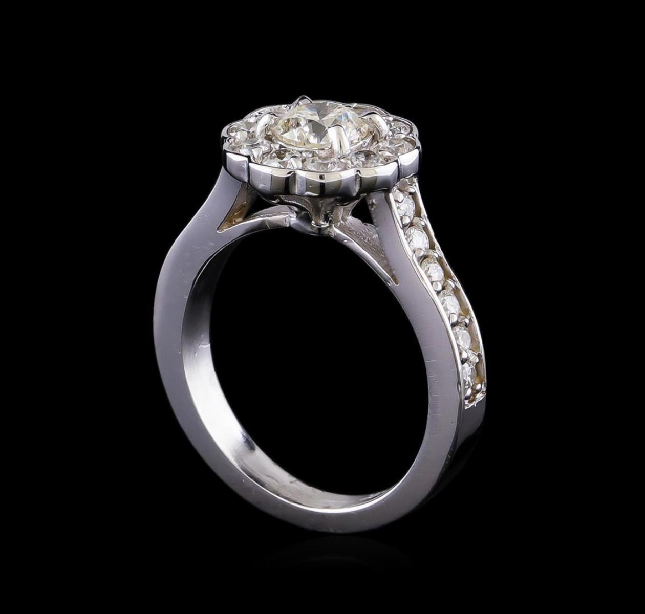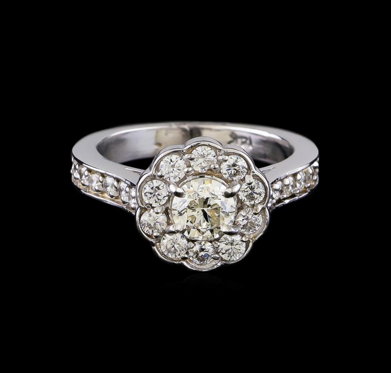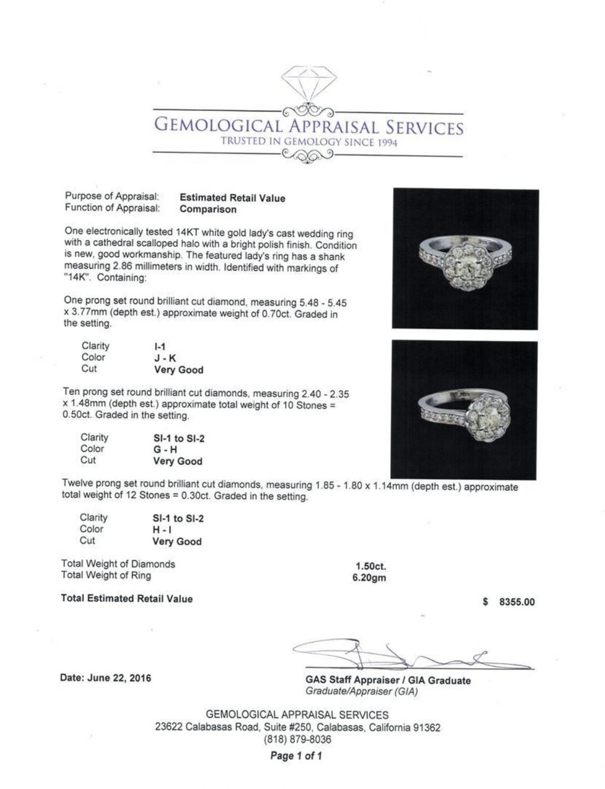 One electronically tested 14KT white gold lady's cast wedding ring with a cathedral scalloped halo with a bright polish finish. The featured lady's ring has a shank measuring 2.86 millimeters in width. Identified with markings of "14K". Condition is new, good workmanship. Containing: One prong set round brilliant cut diamond, measuring 5.48 - 5.45 x 3.77mm (depth est.) approximate weight of 0.70ct. Graded in the setting. Clarity: I-1. Color: J - K. Cut Very Good Ten prong set round brilliant cut diamonds, measuring 2.40 - 2.35 x 1.48mm (depth est.) approximate total weight of 10 Stones = 0.50ct. Graded in the setting. Clarity: SI-1 to SI-2. Color: G - Very Good Twelve prong set round brilliant cut diamonds, measuring 1.85 - 1.80 x 1.14mm (depth est.) approximate total weight of 12 Stones = 0.30ct. Graded in the setting. Clarity: SI-1 to SI-2. Color: H - I. Cut Very Good. Total Weight of Diamonds 1.50ct. Total Weight of Ring 6.20gm. GAS Appraised.
