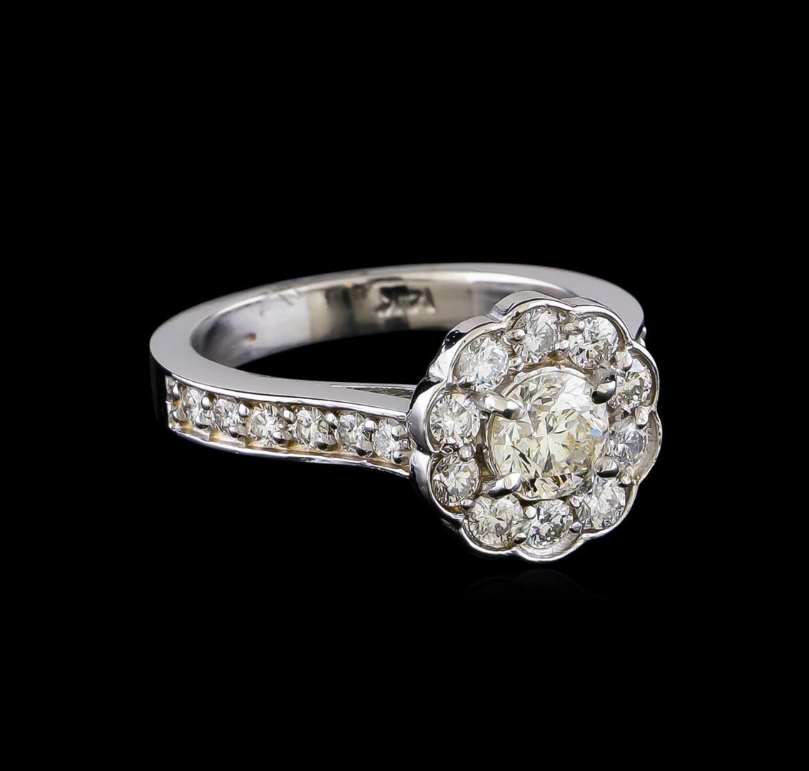 One electronically tested 14KT white gold lady's cast wedding ring with a cathedral scalloped halo with a bright polish finish. The featured lady's ring has a shank measuring 2.86 millimeters in width. Identified with markings of "14K". Condition is new, good workmanship. Containing: One prong set round brilliant cut diamond, measuring 5.48 - 5.45 x 3.77mm (depth est.) approximate weight of 0.70ct. Graded in the setting. Clarity: I-1. Color: J - K. Cut Very Good Ten prong set round brilliant cut diamonds, measuring 2.40 - 2.35 x 1.48mm (depth est.) approximate total weight of 10 Stones = 0.50ct. Graded in the setting. Clarity: SI-1 to SI-2. Color: G - Very Good Twelve prong set round brilliant cut diamonds, measuring 1.85 - 1.80 x 1.14mm (depth est.) approximate total weight of 12 Stones = 0.30ct. Graded in the setting. Clarity: SI-1 to SI-2. Color: H - I. Cut Very Good. Total Weight of Diamonds 1.50ct. Total Weight of Ring 6.20gm. GAS Appraised.