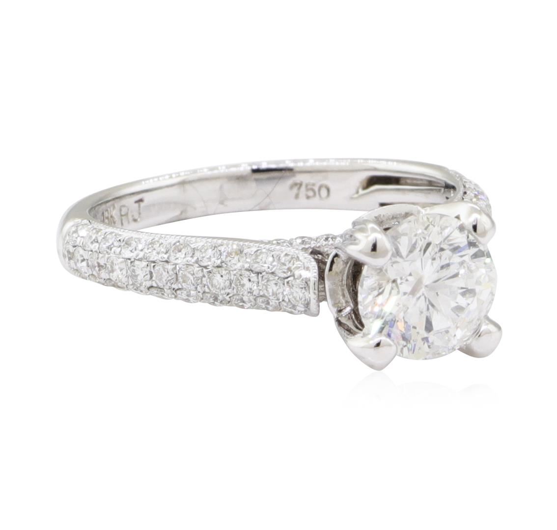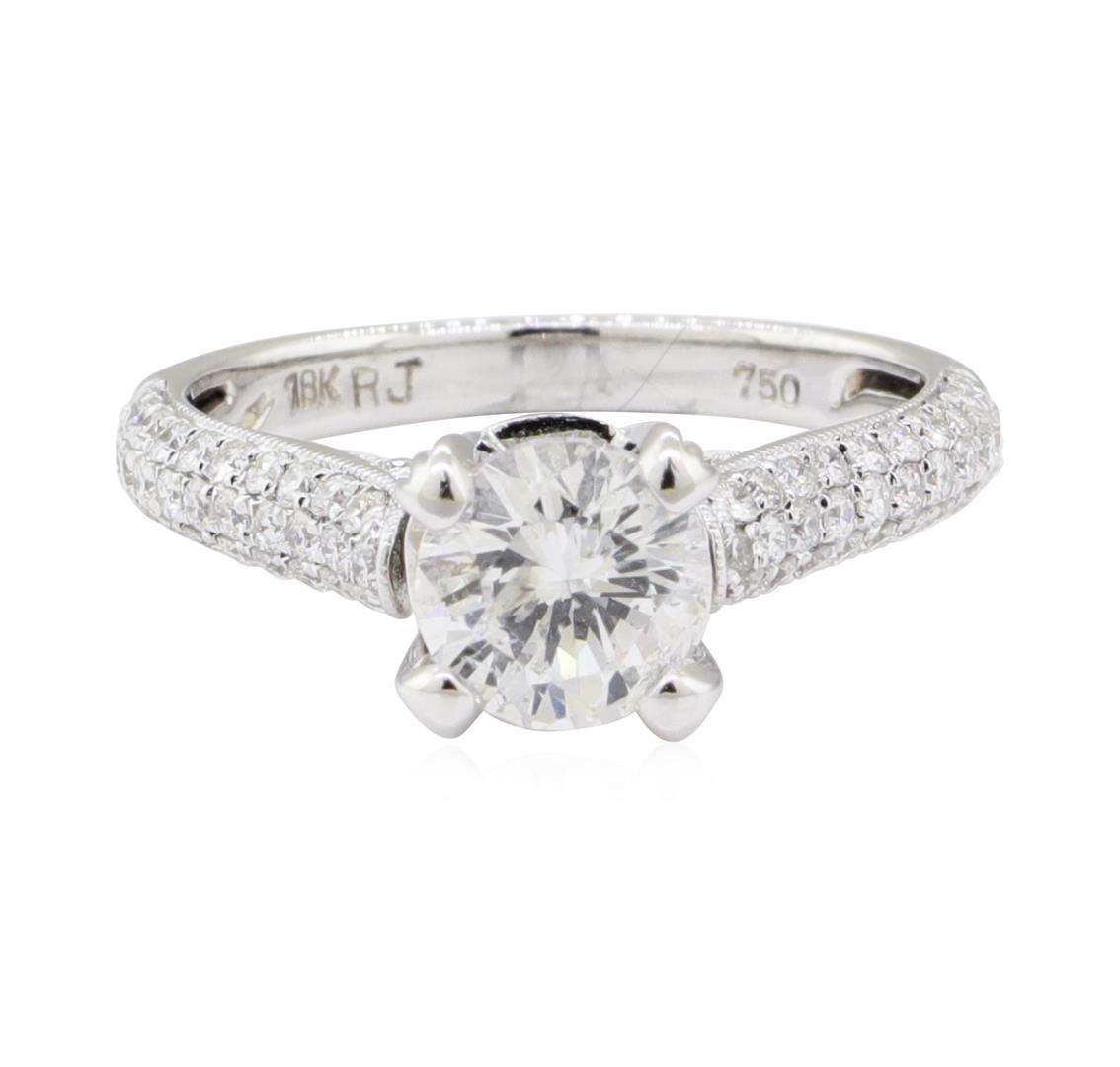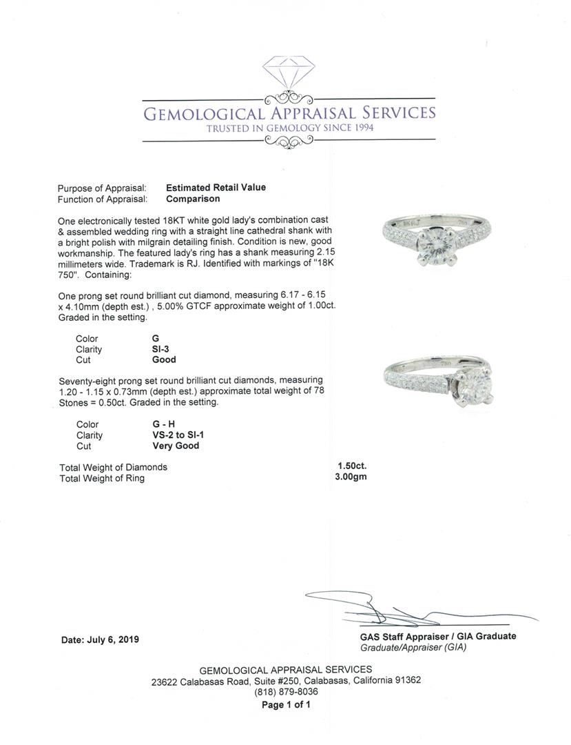 One electronically tested 18KT white gold lady's combination cast & assembled wedding ring with a straight line cathedral shank with a bright polish with milgrain detailing finish. The featured lady's ring has a shank measuring 2.15 millimeters wide. Trademark is RJ. Identified with markings of '18K 750'. Condition is new, good workmanship. Containing: One prong set round brilliant cut diamond, measuring 6.17 - 6.15 x 4.10mm (depth est.) , 5.00.%. GTCF approximate weight of 1.00ct. Graded in the setting. Color G Clarity SI-3 Cut Good Seventy-Eight prong set round brilliant cut diamonds, measuring 1.20 - 1.15 x 0.73mm (depth est.) approximate total weight of 78 Stones = 0.50ct. Graded in the setting. Color G - H Clarity VS-2 to SI-1 Cut Very Good. Total Weight of Diamonds 1.50ct.. Total Weight of Ring 3.00gm GAS Appraised at $11965.00. GAS Appraised.