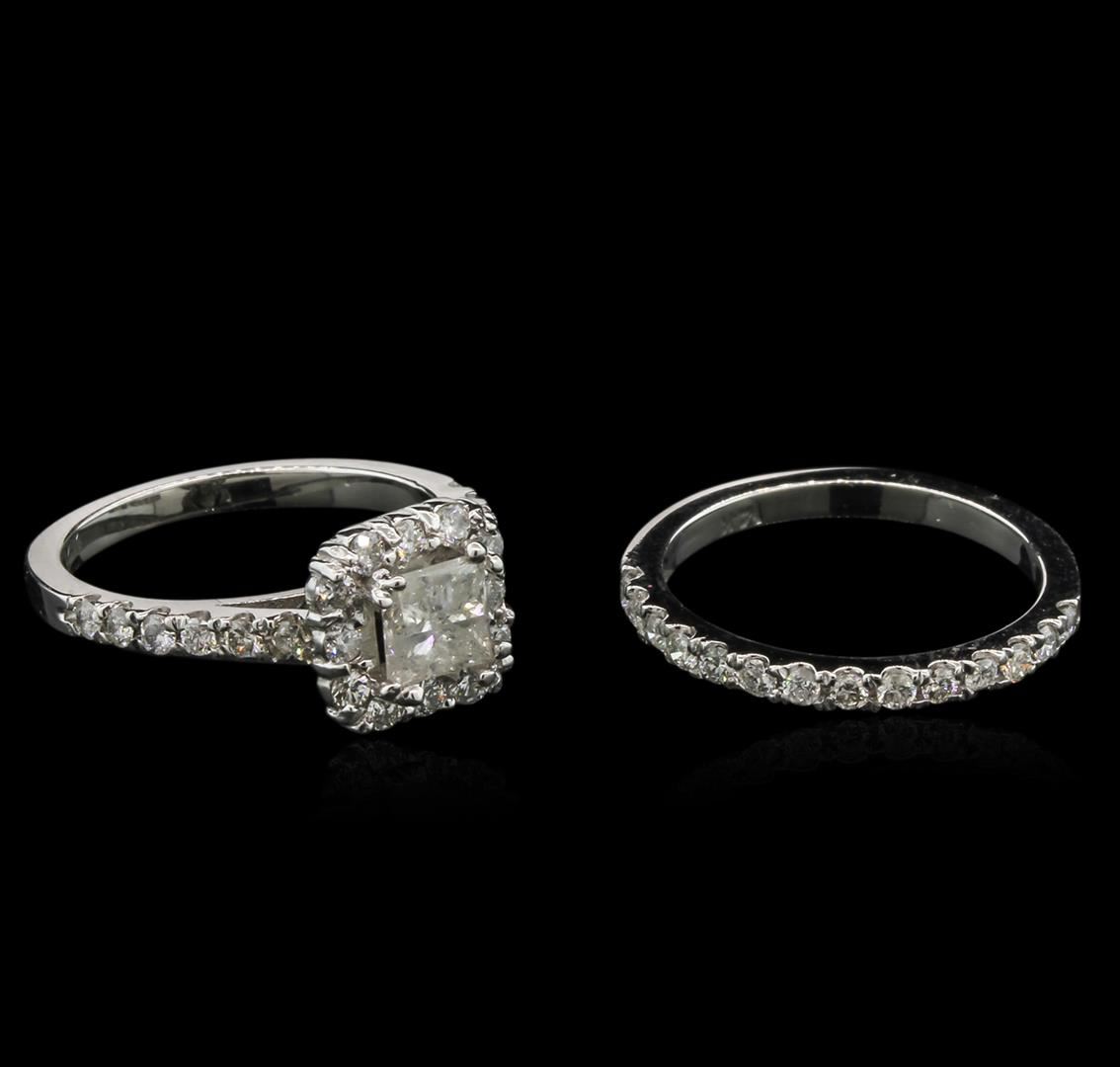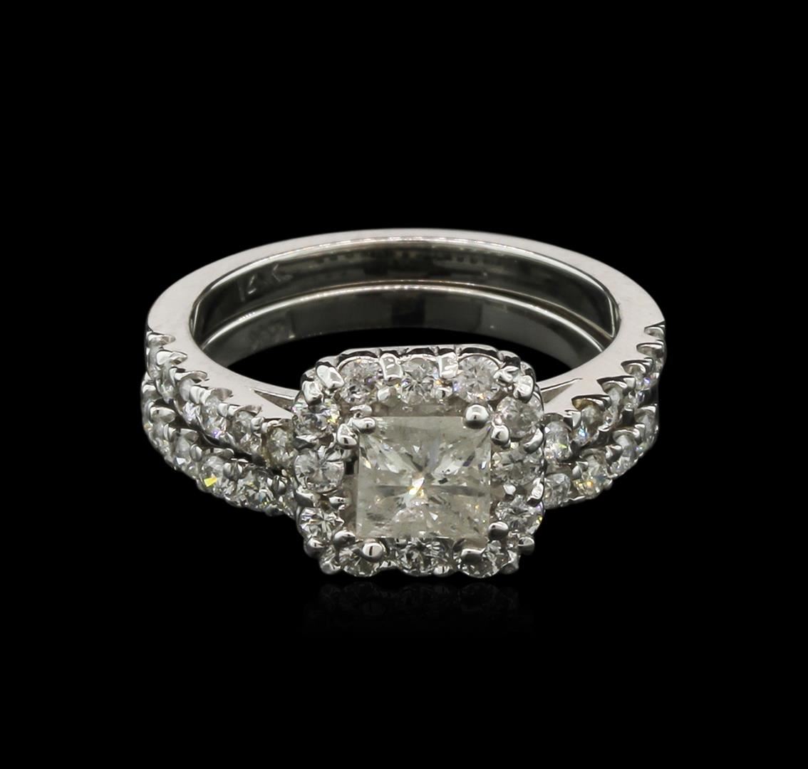 One electronically tested 14KT white gold lady's combination cast & assembled wedding ring & wedding band with a halo with a bright polish finish. The featured wedding set has a 3.9mm double shank Identified with markings of "14K". Condition is new, good workmanship. Containing: One prong set princess cut diamond, measuring 4.90 x 4.80 x 3.74mm (depth est.) approximate weight of 0.75ct. Graded in the setting. Clarity: I-2. Color: I. Cut Good Thirty-Eight split prong set round brilliant cut diamonds, measuring 1.80 - 1.70 x 1.10mm (depth est.) approximate. Total Weight of 38 Stones = 0.75ct. Graded in the setting. Clarity: SI-2 to I-1. Color: H - I. Cut Good. Total Weight of Diamonds 1.50ct. Total Weight of Ring & Wedding Band 5.40gm. GAS Appraised at $6,055.00.