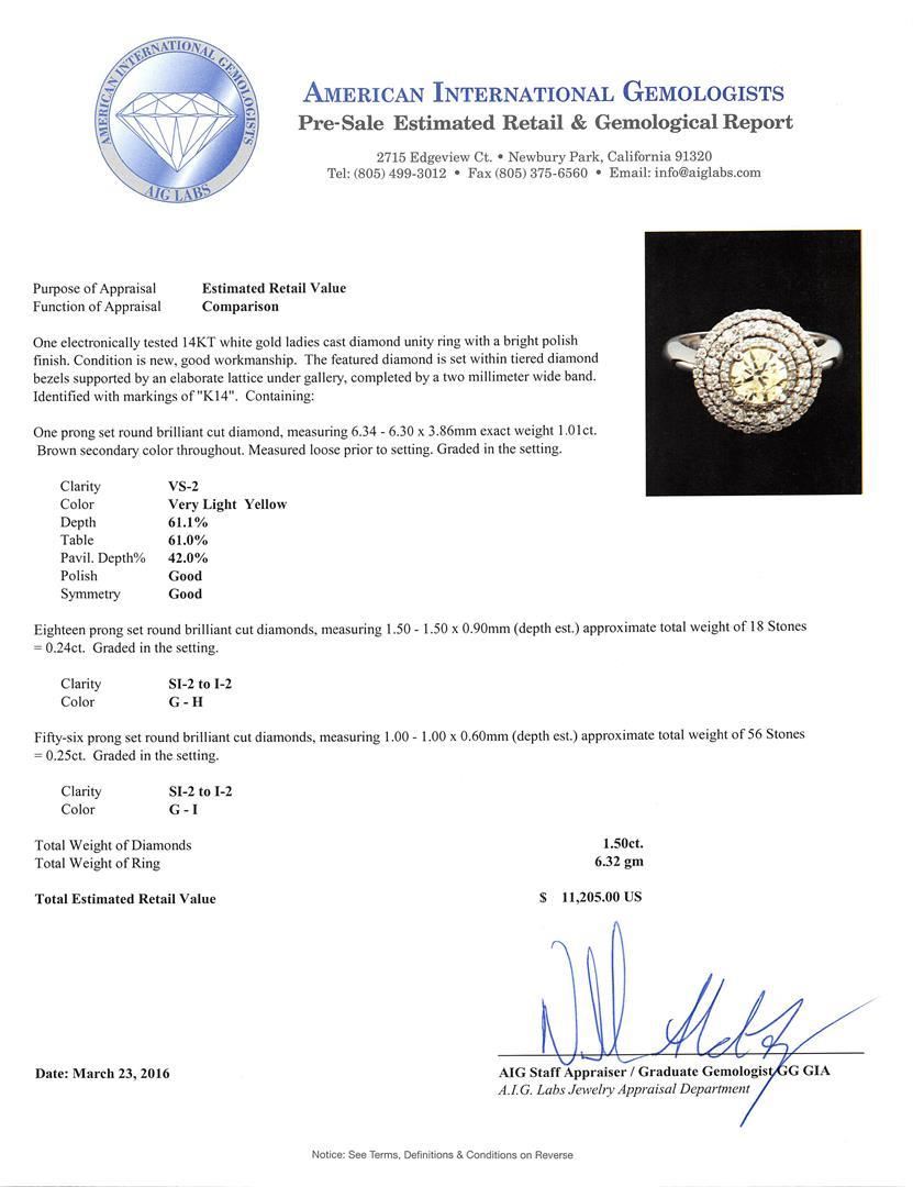 One electronically tested 14KT white gold ladies cast diamond unity ring with a bright polish finish. The featured diamond is set within tiered diamond bezels supported by an elaborate lattice under gallery, completed by a two millimeter wide band. Identified with markings of "K14". Condition is new, good workmanship. Containing: One prong set round brilliant cut diamond, measuring 6.34 - 6.30 x 3.86mm exact weight 1.01ct. Brown secondary color throughout. Measured loose prior to setting. Graded in the setting. Clarity: VS-2. Depth: 61.1%. Table 61.0%. Pavil. Depth%. 42.0%. Eighteen prong set round brilliant cut diamonds, measuring 1.50 - 1.50 x 0.90mm (depth est.) approximate total weight of 18 Stones = 0.24ct. Graded in the setting. Clarity: SI-2 to I-2. Color: G - H Fifty-Six prong set round brilliant cut diamonds, measuring 1.00 - 1.00 x 0.60mm (depth est.) approximate total weight of 56 Stones = 0.25ct. Graded in the setting. Clarity: SI-2 to I-2. Color: G - I. Total Weight of Diamonds 1.50 ct. Total Weight of Ring 6.32gm. AIG Appraised.