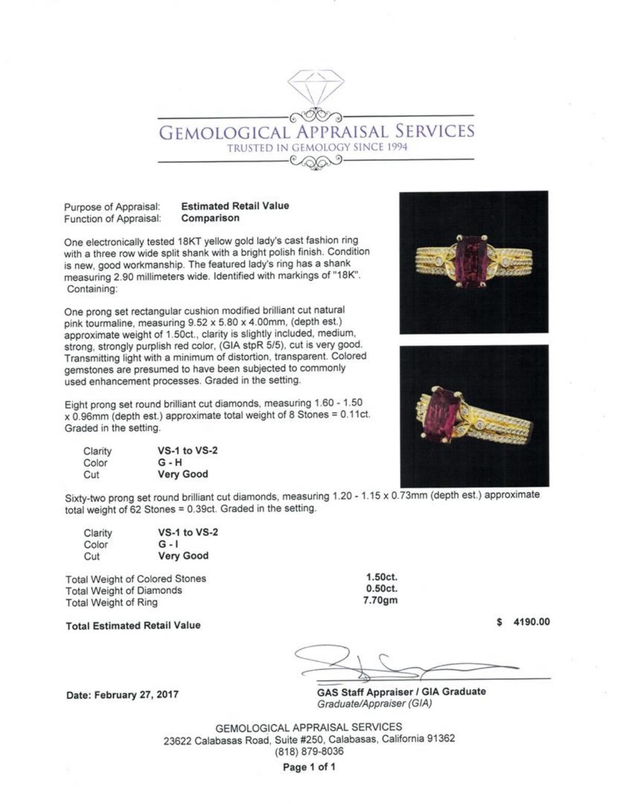 One electronically tested 18KT yellow gold lady's cast fashion ring with a three row wide split shank with a bright polish finish. The featured lady's ring has a shank measuring 2.90 millimeters wide. Identified with markings of '18K'. Condition is new, good workmanship. Containing: One prong set rectangular cushion modified brilliant cut natural pink tourmaline, measuring 9.52 x 5.80 x 4.00mm, (depth est.) approximate weight of 1.50ct., clarity is slightly included, medium, strong, strongly purplish red color, (GIA stpR 5/5), cut is very good. Transmitting light with a minimum of distortion, transparent. Colored gemstones are presumed to have been subjected to commonly used enhancement processes. Graded in the setting. Eight prong set round brilliant cut diamonds, measuring 1.60 - 1.50 x 0.96mm (depth est.) approximate total weight of 8 Stones = 0.11ct. Graded in the setting. Color G - H Clarity VS-1 to VS-2 Cut Very Good Sixty-Two prong set round brilliant cut diamonds, measuring 1.20 - 1.15 x 0.73mm (depth est.) approximate total weight of 62 Stones = 0.39ct. Graded in the setting. Color G - I Clarity VS-1 to VS-2 Cut Very Good. Total Weight of Colored Stones 1.50ct.. Total Weight of Diamonds 0.50ct.. Total Weight of Ring 7.70gm. GAS Appraised.
