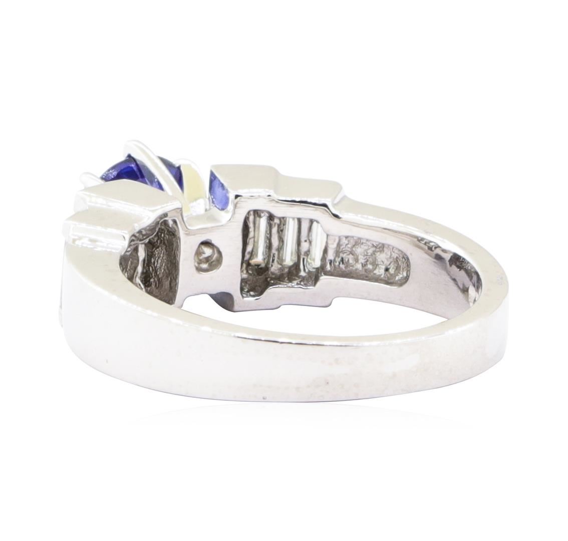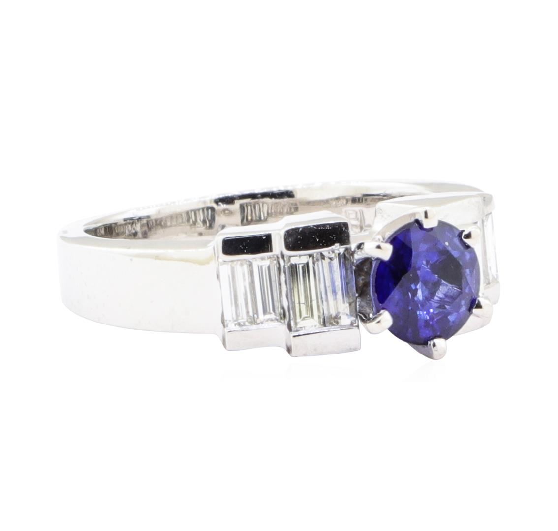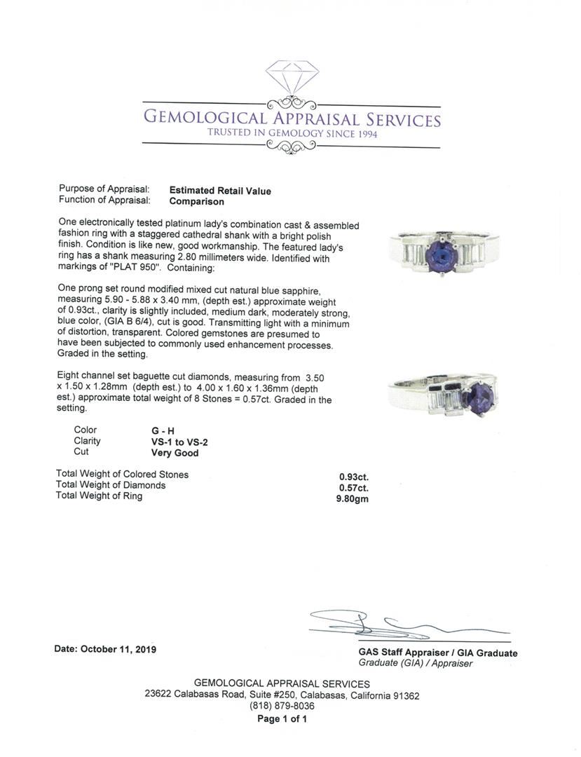 One electronically tested platinum lady's combination cast & assembled fashion ring with a staggered cathedral shank with a bright polish finish. The featured lady's ring has a shank measuring 2.80 millimeters wide. Identified with markings of 'PLAT 950'. Condition is Good. Containing: One prong set round modified mixed cut natural blue sapphire, measuring 5.90 - 5.88 x 3.40 mm, (depth est.) approximate weight of 0.93ct., clarity is slightly included, medium dark, moderately strong, blue color, (GIA B 6/4), cut is good. Transmitting light with a minimum of distortion, transparent. Colored gemstones are presumed to have been subjected to commonly used enhancement processes. Graded in the setting. Eight channel set baguette cut diamonds, measuring from 3.50 x 1.50 x 1.28mm (depth est.) to 4.00 x 1.60 x 1.36mm (depth est.) approximate total weight of 8 Stones = 0.57ct. Graded in the setting. Color G - H Clarity VS-1 to VS-2 Cut Very Good. Total Weight of Colored Stones 0.93ct.. Total Weight of Diamonds 0.57ct.. Total Weight of Ring 9.80gm GAS Appraised at $4615.00. GAS Appraised.