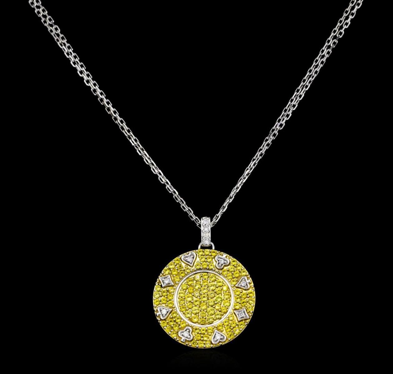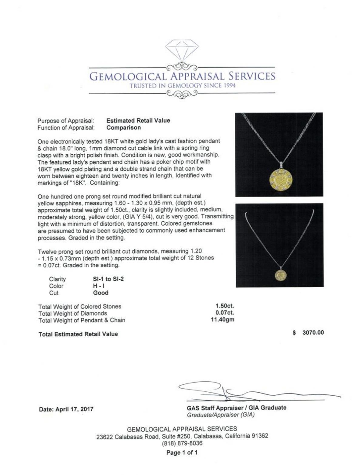 One electronically tested 18KT white gold lady's cast fashion pendant & chain 18.0' long, 1mm diamond cut cable link with a spring ring clasp with a bright polish finish. The featured lady's pendant and chain has a poker chip motif with 18KT yellow gold plating and a double strand chain that can be worn between eighteen and twenty inches in length. Identified with markings of '18K'. Condition is new, good workmanship. Containing: One hundred one prong set round modified brilliant cut natural yellow sapphires, measuring 1.60 - 1.30 x 0.95 mm, (depth est.) approximate total weight of 1.50ct., clarity is slightly included, medium, moderately strong, yellow color, (GIA Y 5/4), cut is very good. Transmitting light with a minimum of distortion, transparent. Colored gemstones are presumed to have been subjected to commonly used enhancement processes. Graded in the setting. Twelve prong set round brilliant cut diamonds, measuring 1.20 - 1.15 x 0.73mm (depth est.) approximate total weight of 12 Stones = 0.07ct. Graded in the setting. Color H - I Clarity SI-1 to SI-2 Cut Good. Total Weight of Colored Stones 1.50ct.. Total Weight of Diamonds 0.07ct.. Total Weight of Pendant & Chain 11.40gm GAS Appraised at $3070.00. GAS Appraised at $3,070.00.