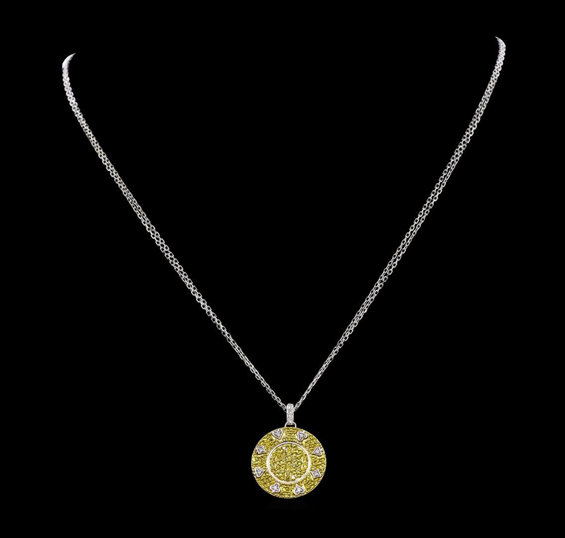 One electronically tested 18KT white gold lady's cast fashion pendant & chain 18.0' long, 1mm diamond cut cable link with a spring ring clasp with a bright polish finish. The featured lady's pendant and chain has a poker chip motif with 18KT yellow gold plating and a double strand chain that can be worn between eighteen and twenty inches in length. Identified with markings of '18K'. Condition is new, good workmanship. Containing: One hundred one prong set round modified brilliant cut natural yellow sapphires, measuring 1.60 - 1.30 x 0.95 mm, (depth est.) approximate total weight of 1.50ct., clarity is slightly included, medium, moderately strong, yellow color, (GIA Y 5/4), cut is very good. Transmitting light with a minimum of distortion, transparent. Colored gemstones are presumed to have been subjected to commonly used enhancement processes. Graded in the setting. Twelve prong set round brilliant cut diamonds, measuring 1.20 - 1.15 x 0.73mm (depth est.) approximate total weight of 12 Stones = 0.07ct. Graded in the setting. Color H - I Clarity SI-1 to SI-2 Cut Good. Total Weight of Colored Stones 1.50ct.. Total Weight of Diamonds 0.07ct.. Total Weight of Pendant & Chain 11.40gm GAS Appraised at $3070.00. GAS Appraised.