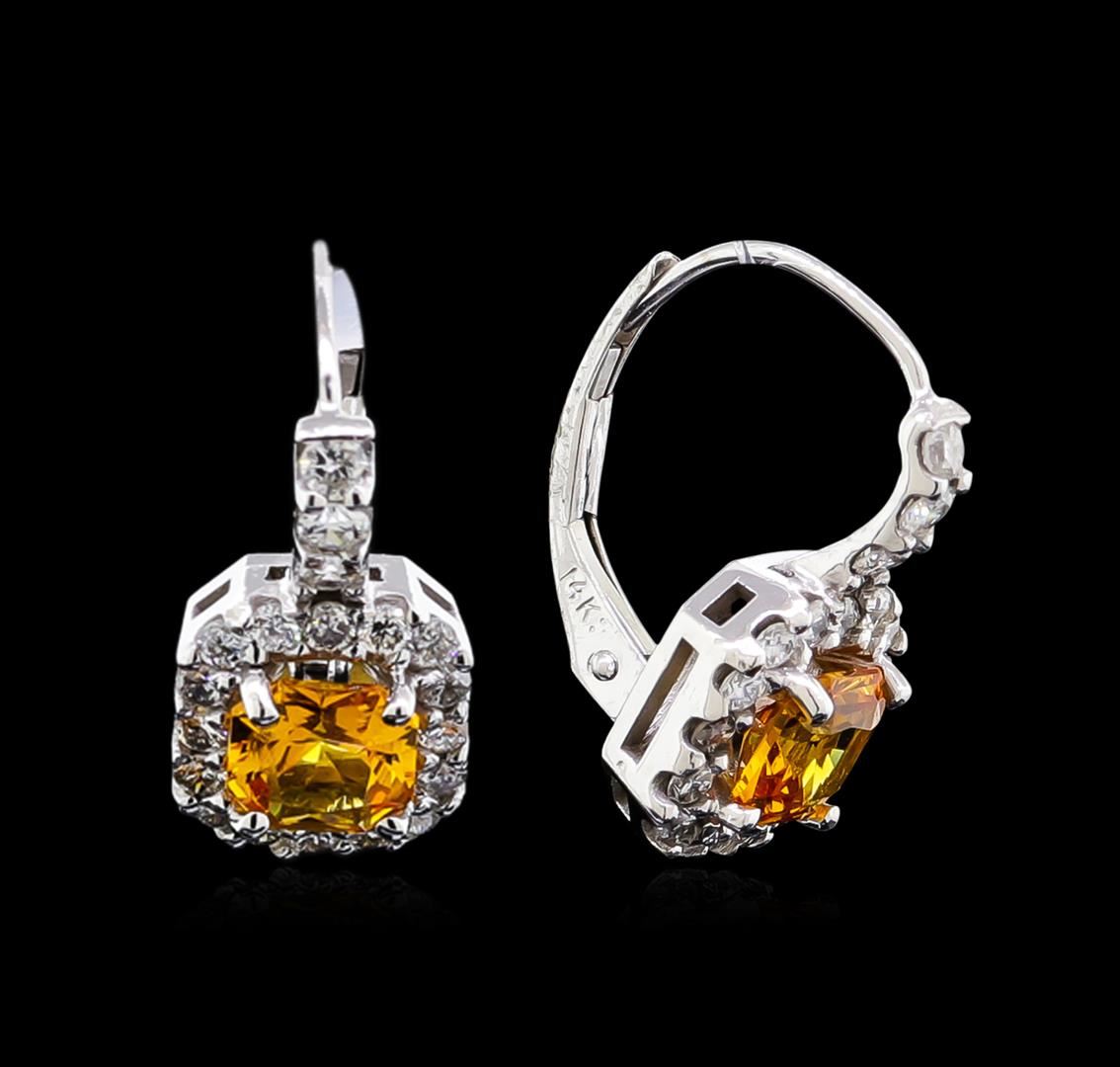 One Pair 14KT white gold 1.50 ct sapphire and diamond earrings. Metal: 14KT solid white gold. Face Measurements: 8 x 15mm. Finish: Bright polish. Total Item Weight: 3.2 grams. Markings: Stamped 14K. Containing: 2 cushion cut Sapphires with a total weight of 1.50 ct. Measuring: 5 x 5mm. Color: Yellow. Treatment: None. Setting: Prong. Saturation: Moderately strong. Tone: Medium Dark. Clarity: Type 2. Cut: Very good. The sapphires are complemented by 38 round Diamonds with a total weight of 0.80 ct. Measuring: 1.5 - 2mm. Treatment: None. Setting: Prong. Color Grade: G - H. Clarity: VS2 - SI1. Cut: Very good. Excellent workmanship. Gemstones graded in the setting. BHGL Appraised.