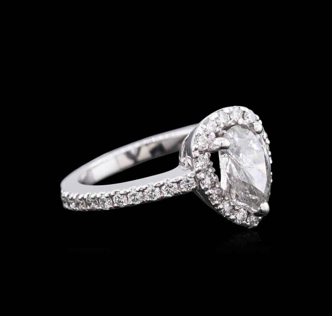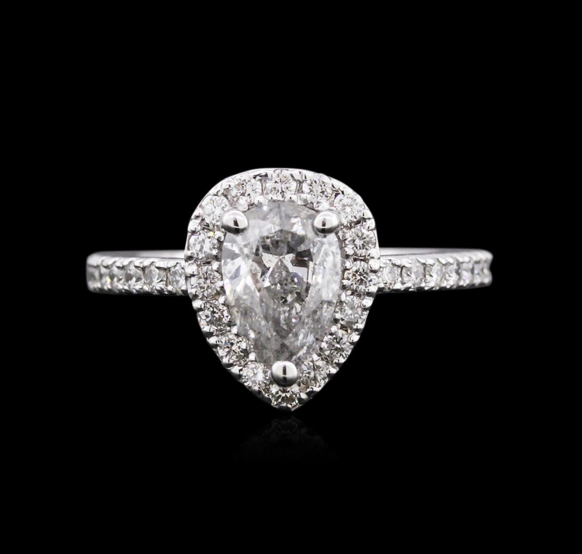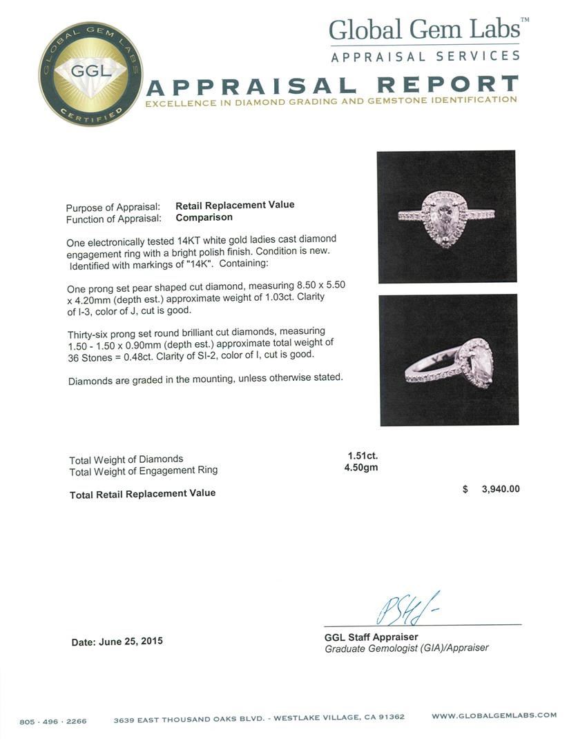 One electronically tested 14KT white gold ladies cast diamond engagement ring with a bright polish finish. Condition is new. Identified with markings of "14K". Containing: One prong set pear shaped cut diamond, measuring 8.50 x 5.50 x 4.20mm (depth est.) approximate weight of 1.03ct. Clarity of 1-3, color of J, cut is good. Thirty-six prong set round brilliant cut diamonds, measuring 1.50 - 1.50 x 0.90mm (depth est.) approximate total weight of 36 Stones = 0.48ct. Clarity of SI-2, color of I, cut is good. Diamonds are graded in the mounting, unless otherwise stated. Total Weight of Diamonds Total Weight of Engagement Ring 1.51ct. 4.50gm
