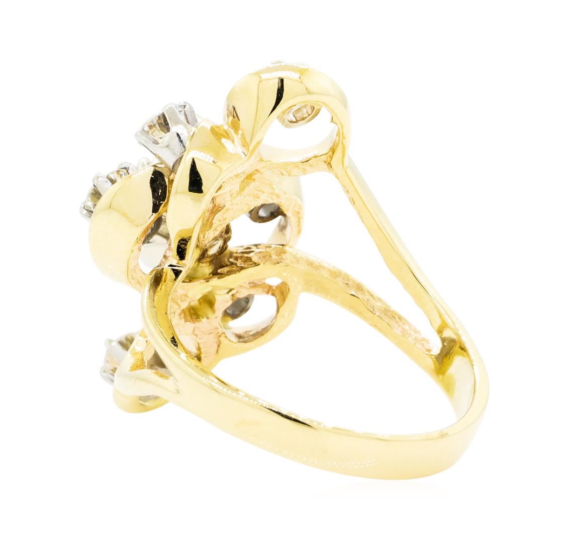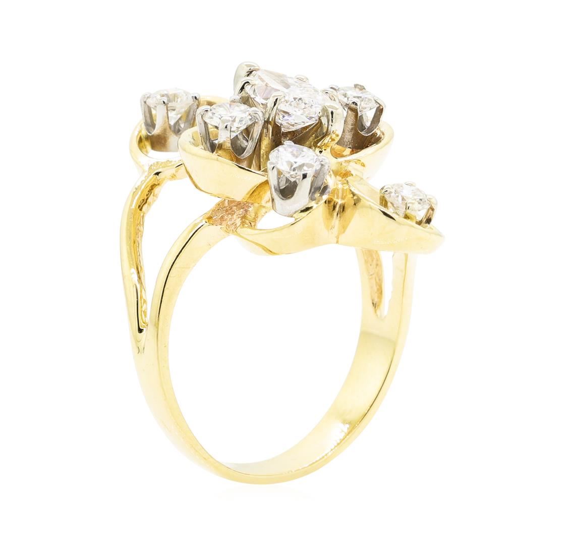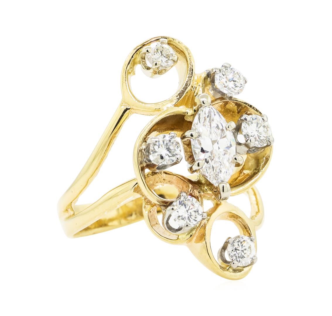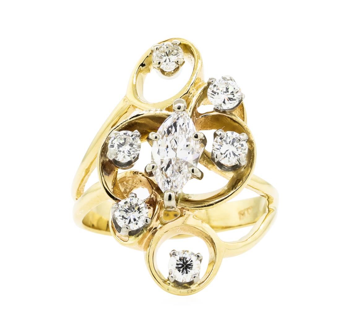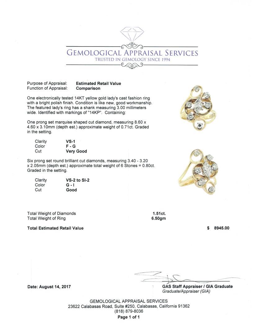 One electronically tested 14KT yellow gold lady's cast fashion ring with a bright polish finish. The featured lady's ring has a shank measuring 3.00 millimeters wide. Identified with markings of '14KP'. Condition is like new, good workmanship. Containing: One prong set marquise shaped cut diamond, measuring 8.60 x 4.60 x 3.10mm (depth est.) approximate weight of 0.71ct. Graded in the setting. Color F - G Clarity VS-1 Cut Very Good Six prong set round brilliant cut diamonds, measuring 3.40 - 3.20 x 2.05mm (depth est.) approximate total weight of 6 Stones = 0.80ct. Graded in the setting. Color G - I Clarity VS-2 to SI-2 Cut Good. Total Weight of Diamonds 1.51ct.. Total Weight of Ring 6.50gm GAS Appraised at $8945.00. GAS Appraised.