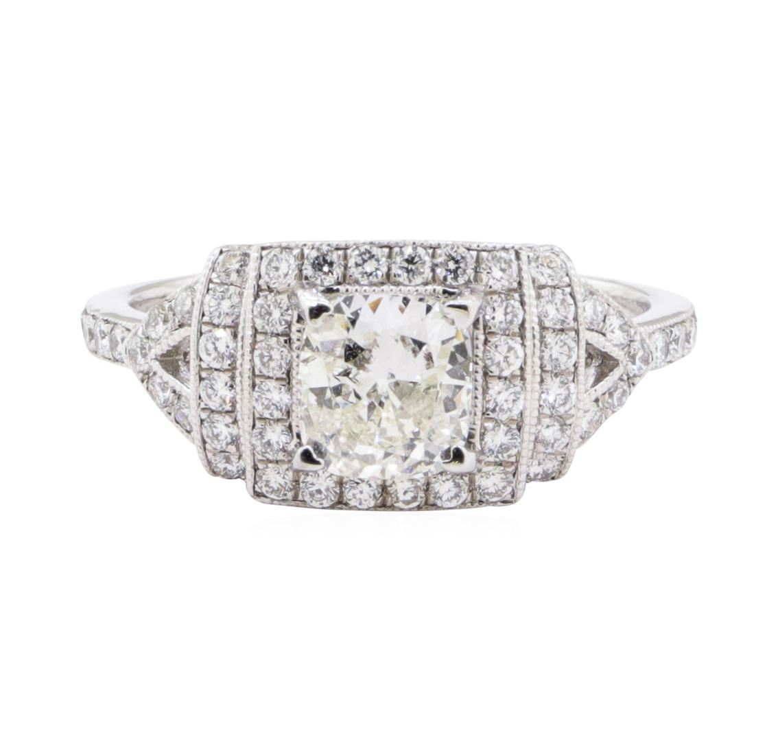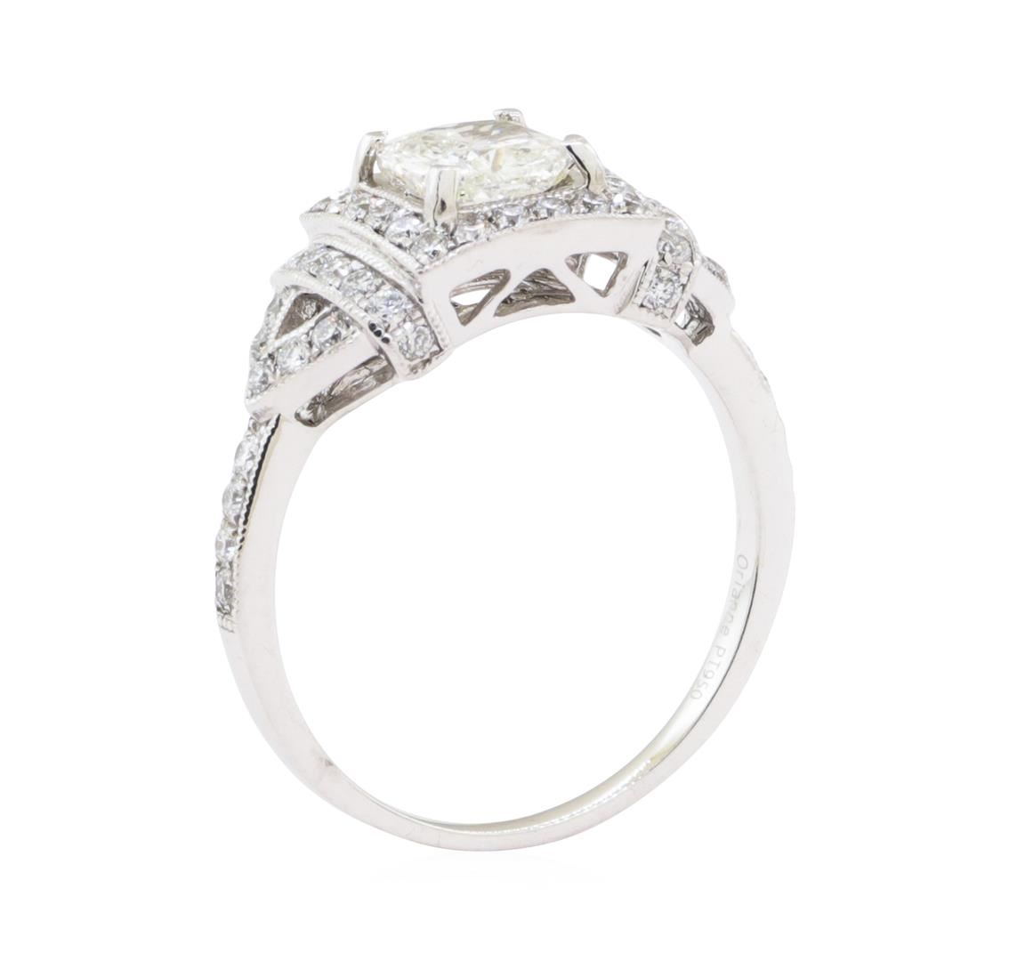 One electronically tested platinum ladies cast diamond unity ring. The featured diamond is set within a tiered diamond bezel, supported by a lattice under gallery and diamond set shoulders, completed by a one millimeter wide band. Trademark is Orianne. Identified with markings of "PT950". Condition is new, good workmanship. Containing: One prong set cushion cut diamond, measuring 6.28 x 5.75 x 3.45mm (depth est.) approximate weight of 0.98ct. Graded in the setting. Clarity SI-3 Color H Depth 60.0% Table 63.5% Fifty-Four prong set round brilliant cut diamonds, measuring 1.40 - 1.30 x 0.82mm (depth est.) approximate total weight of 54 Stones = 0.53ct. Graded in the setting. Clarity VS-2 to SI-1 Color G - I Total Weight of Diamonds 1.51 ct. Total Weight of Ring 5.60 gm Estimated Retail Value $ 9,155.00 US
