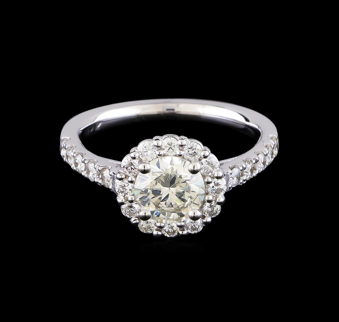 One electronically tested 14KT white gold lady's cast wedding ring with a basket halo with a bright polish finish. The featured lady's ring has a shank measuring 2.03 millimeters in width. Identified with markings of "14K". Condition is new, good workmanship. Containing: One prong set round brilliant cut diamond, measuring 6.55 - 6.51 x 3.81mm (depth est.) approximate weight of 1.01ct. Graded in the setting. Clarity: I-1. Color: I - Good Twenty-Two prong set round brilliant cut diamonds, measuring 1.85 - 1.80 x 1.12mm (depth est.) approximate total weight of 22 Stones = 0.51ct. Graded in the setting. Clarity: SI-1 to I-1. Color: H - I. Cut Good. Total Weight of Diamonds 1.52ct. Total Weight of Ring 3.90gm GAS Appraised.