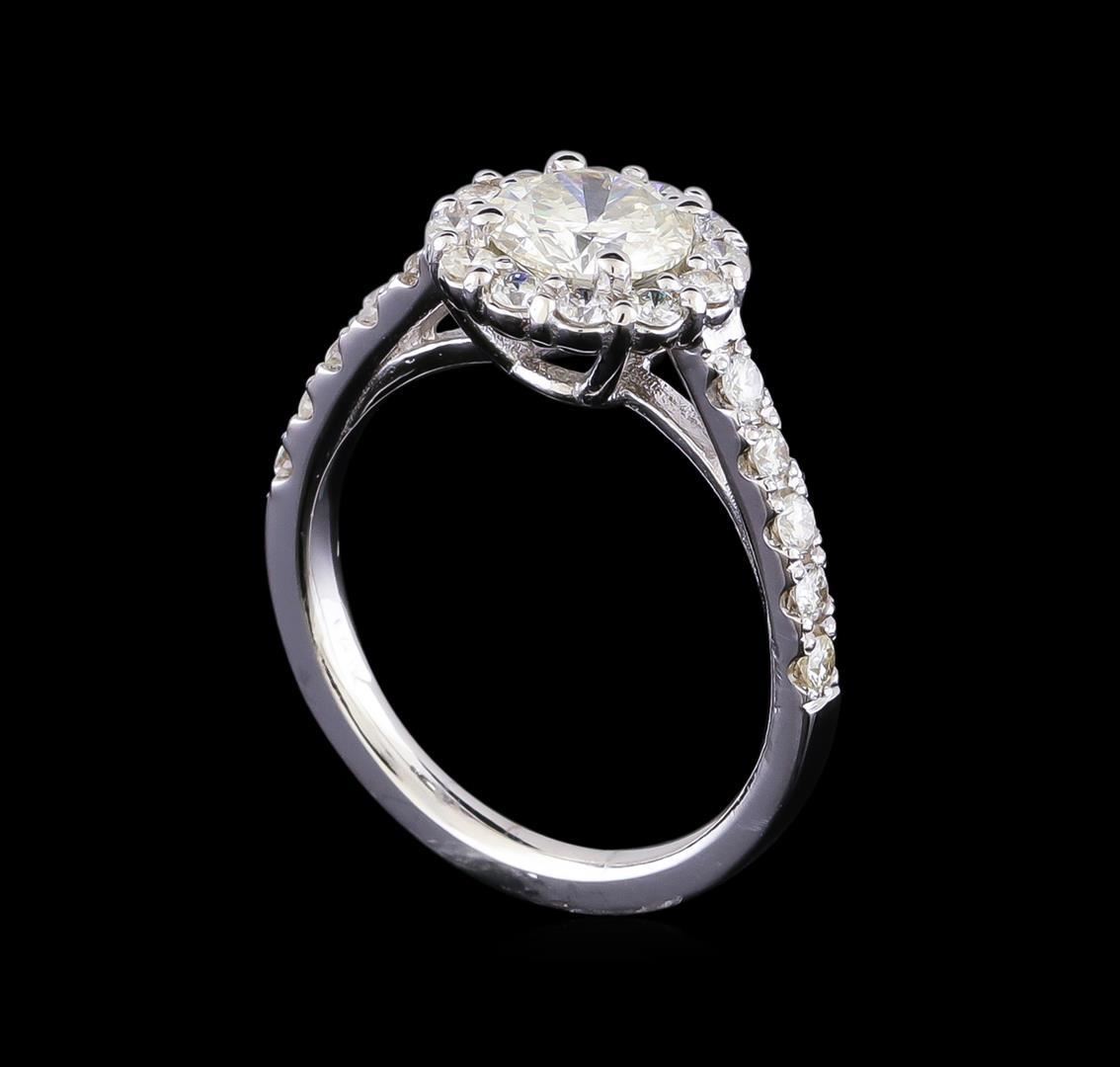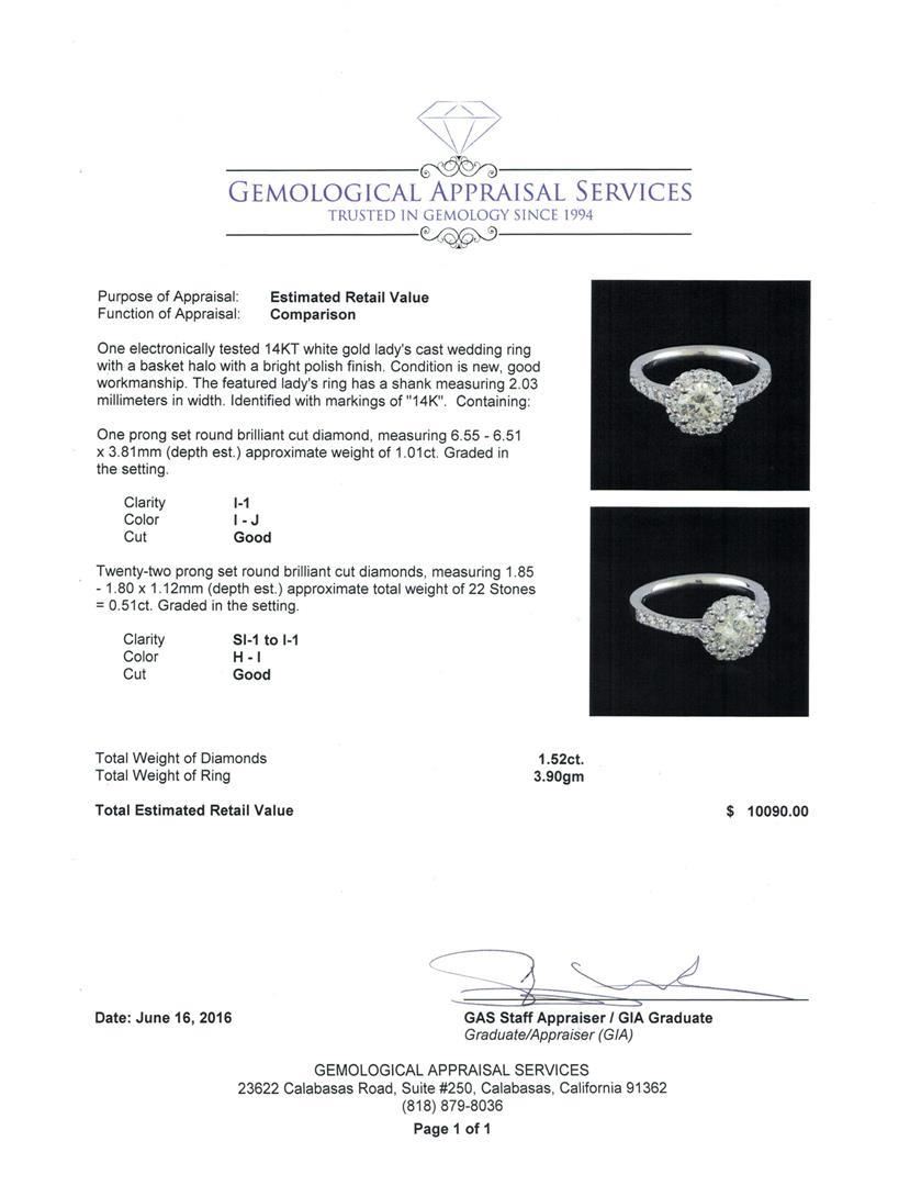 One electronically tested 14KT white gold lady's cast wedding ring with a basket halo with a bright polish finish. The featured lady's ring has a shank measuring 2.03 millimeters in width. Identified with markings of "14K". Condition is new, good workmanship. Containing: One prong set round brilliant cut diamond, measuring 6.55 - 6.51 x 3.81mm (depth est.) approximate weight of 1.01ct. Graded in the setting. Clarity: I-1. Color: I - Good Twenty-Two prong set round brilliant cut diamonds, measuring 1.85 - 1.80 x 1.12mm (depth est.) approximate total weight of 22 Stones = 0.51ct. Graded in the setting. Clarity: SI-1 to I-1. Color: H - I. Cut Good. Total Weight of Diamonds 1.52ct. Total Weight of Ring 3.90gm GAS Appraised.