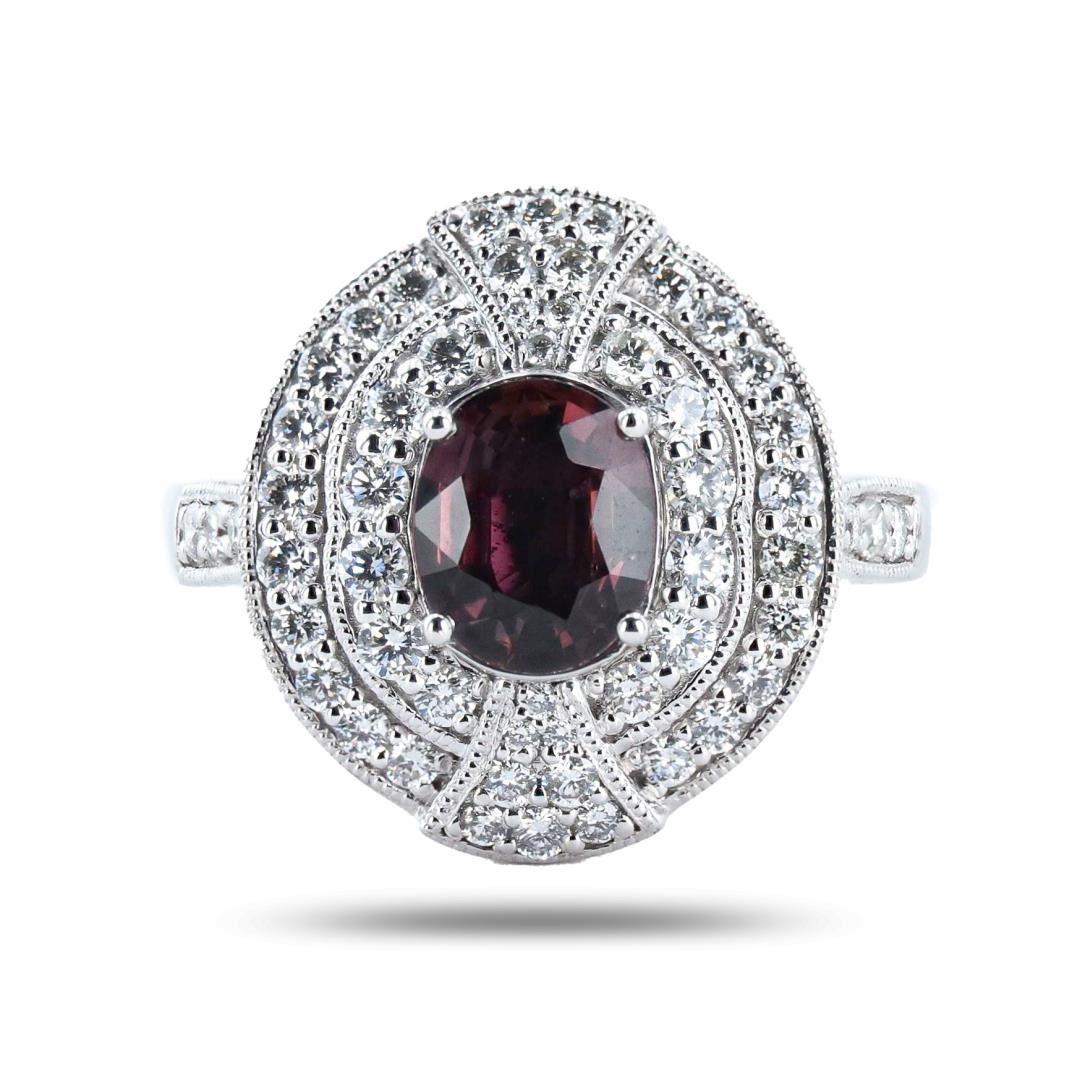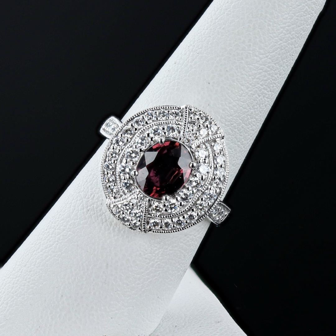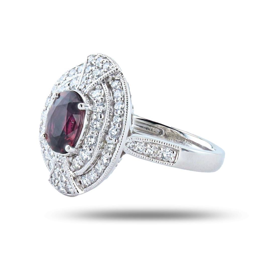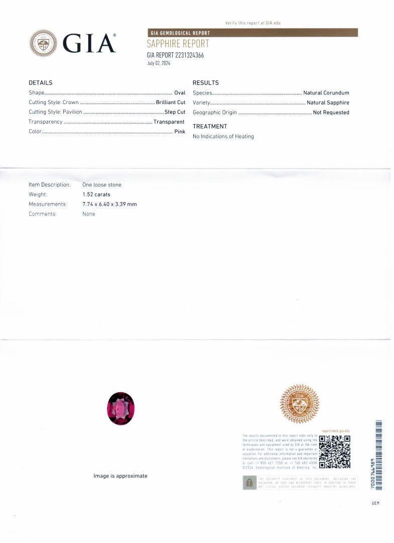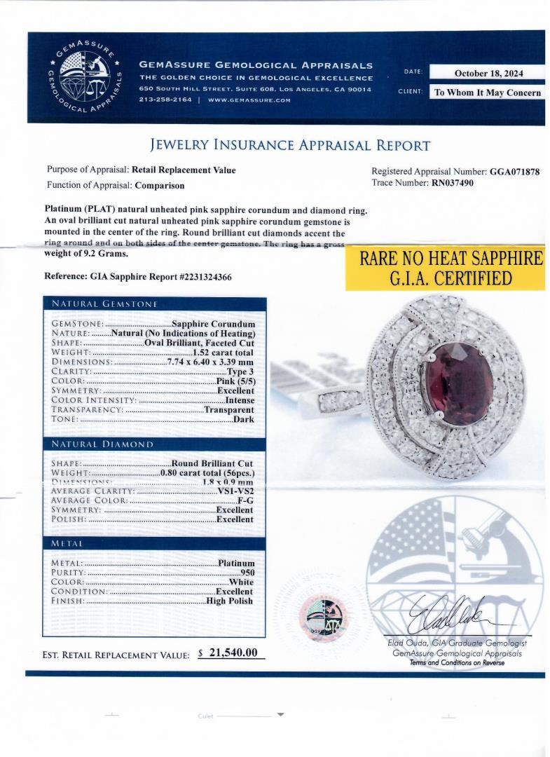 Platinum (PLAT) natural unheated pink sapphire corundum and diamond ring. An oval brilliant cut natural unheated pink sapphire corundum gemstone is mounted in the center of the ring. Round brilliant cut diamonds accent the ring around and on both sides of the center gemstone. The ring has a gross weight of 9.2 Grams. Reference: GIA Sapphire Report 2231324366 Brand: Oscar Friedman #NATURAL GEMSTONE# GEMSTONE: Sapphire Corundum; NATURE: Natural (No Indications of Heating); SHAPE: Oval Brilliant, Faceted Cut; WEIGHT: 1.52 carat total; DIMENSIONS: 7.74 x 6.40 x 3.39mm; CLARITY: Type 3; COLOR: Pink (5/5); SYMMETRY: Excellent; COLOR INTENSITY: Intense; TRANSPARENCY: Transparent; TONE: Dark #NATURAL DIAMOND# SHAPE: Round Brilliant Cut; WEIGHT: 0.80 carat total (S6pcs.); DIMENSIONS: 1.8 x 0.9mm; AVERAGE CLARITY: VS1-VS2; AVERAGE COLOR: F-G; SYMMETRY: Excellent; POLISH: Excellent #METAL# METAL: Platinum: PURITY: 950; COLOR: White; CONDITION: Excellent; FINISH: High Polish #Size: 7