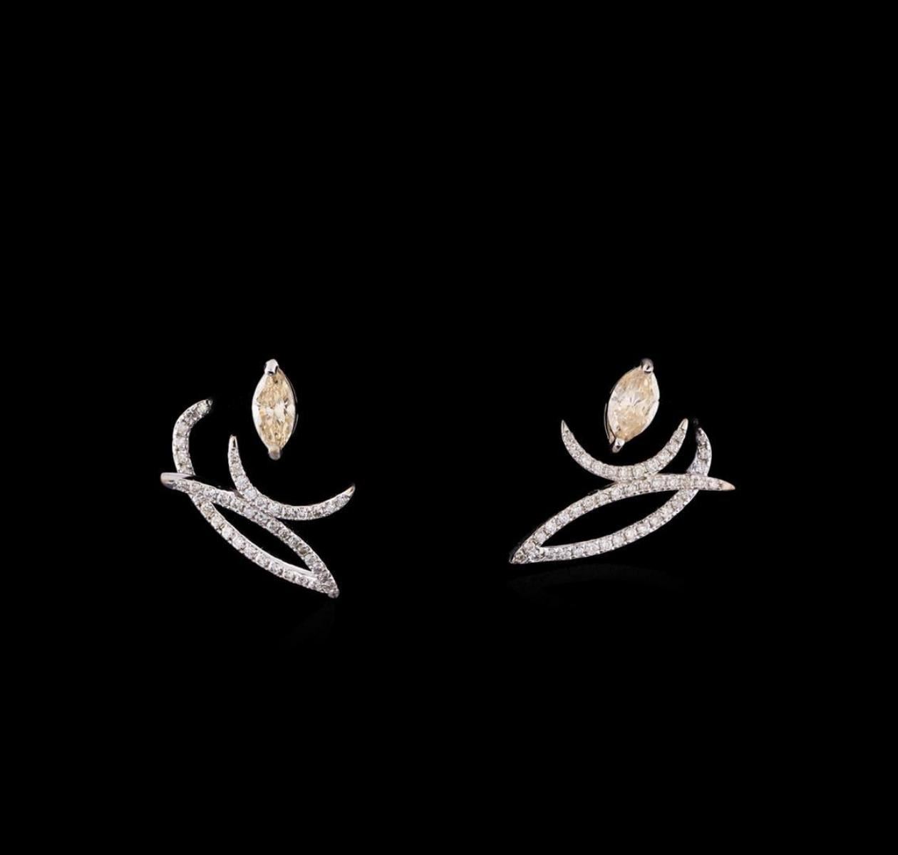 One pair electronically tested 14KT white gold lady's combination cast & assembled fashion earrings with earring jackets with heavy friction backs with a bright polish finish. Identified with markings of "14K". Condition is new, good workmanship. Containing: Two prong set marquise shaped cut diamonds, measuring 7.30 x 3.96 x 2.69mm (depth est.) approximate total weight of 2 Stones = 0.97ct. Graded in the setting. Clarity: SI-2 to I-1. Color: O - P. Cut Good Ninety round brilliant cut diamonds, measuring 1.20 - 1.15 x 0.73mm (depth est.) approximate total weight of 90 Stones = 0.56ct. Graded in the setting. Clarity: SI-1 to SI-2. Color: G - Good. Total Weight of Diamonds 1.53ct. Total Weight of Earrings With Earring Jackets 5.80gm. GAS Appraised.