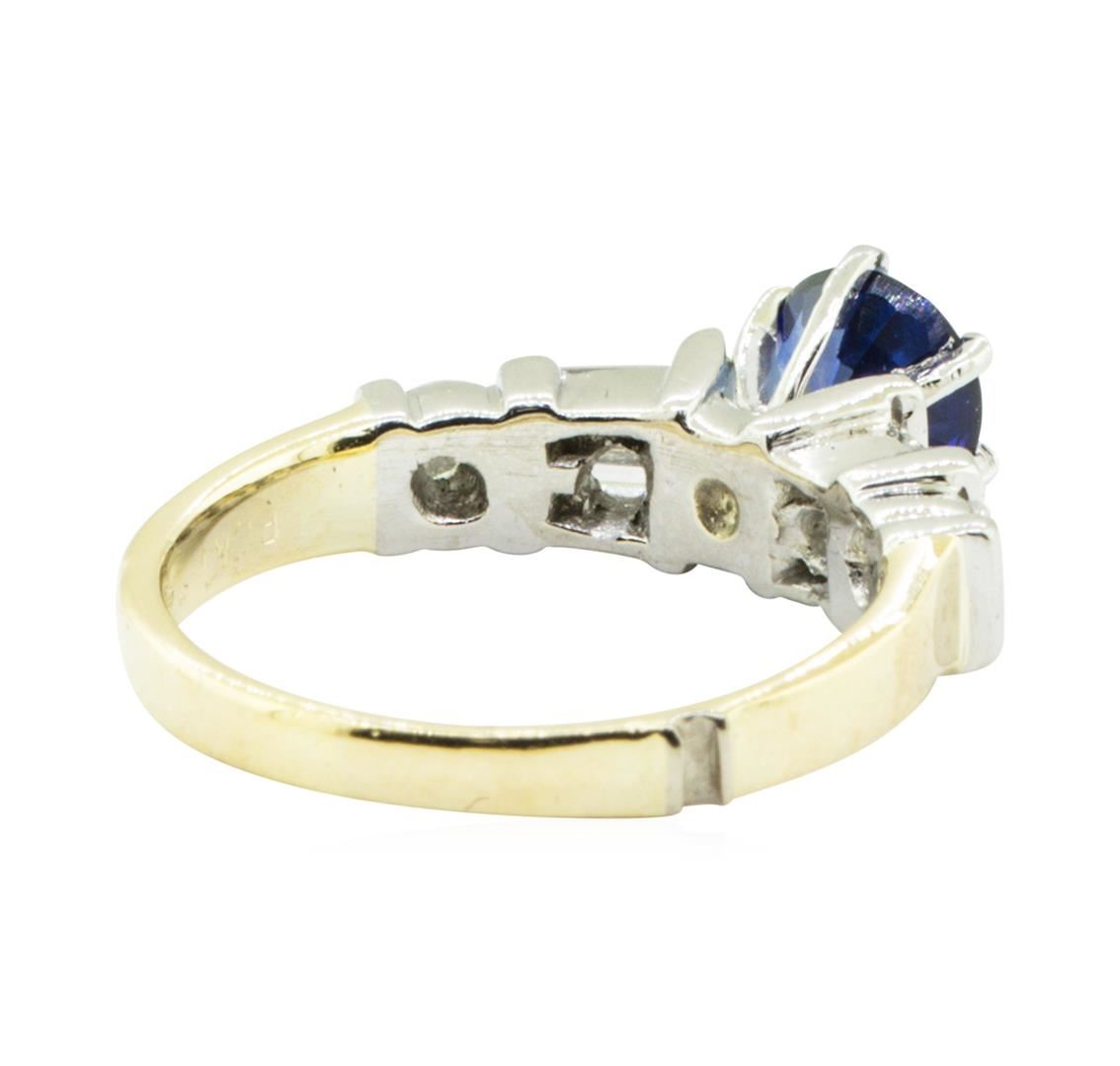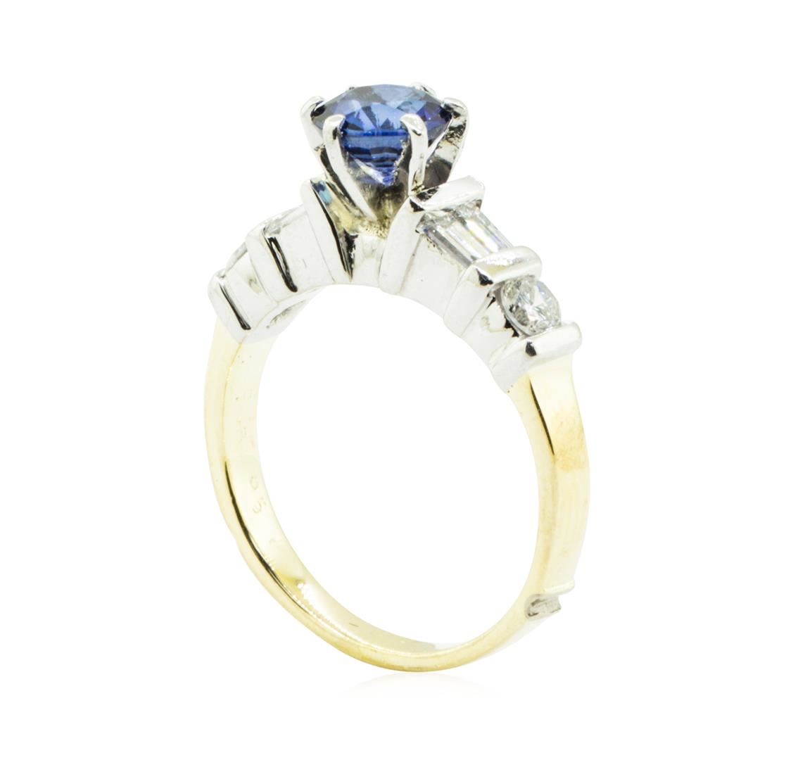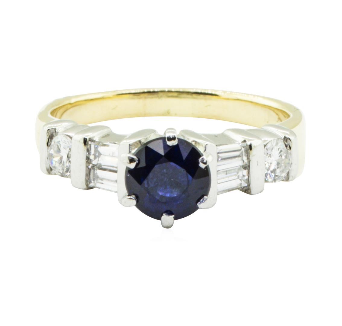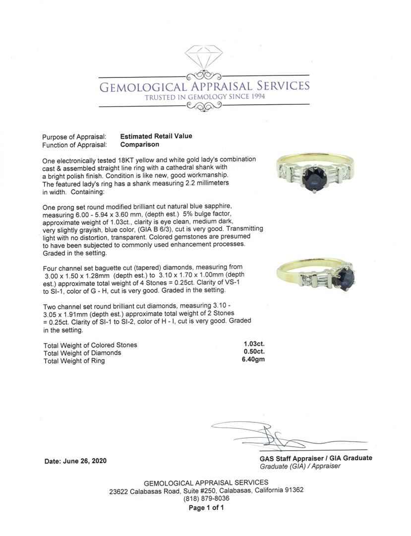 One electronically tested 18KT yellow and white gold lady's combination cast & assembled straight line ring with a cathedral shank with a bright polish finish. The featured lady's ring has a shank measuring 2.2 millimeters in width. Condition is like new, good workmanship. Containing: One prong set round modified brilliant cut natural blue sapphire, measuring 6.00 - 5.94 x 3.60 mm, (depth est.) 5%. bulge factor, approximate weight of 1.03ct., clarity is eye clean, medium dark, very slightly grayish, blue color, (GIA B 6/3), cut is very good. Transmitting light with no distortion, transparent. Colored gemstones are presumed to have been subjected to commonly used enhancement processes. Graded in the setting. Four channel set baguette cut (tapered) diamonds, measuring from 3.00 x 1.50 x 1.28mm (depth est.) to 3.10 x 1.70 x 1.00mm (depth est.) approximate total weight of 4 Stones = 0.25ct. Graded in the setting. Color G - H Clarity VS-1 to SI-1 Cut Very Good Two channel set round brilliant cut diamonds, measuring 3.10 - 3.05 x 1.91mm (depth est.) approximate total weight of 2 Stones = 0.25ct. Graded in the setting. Color H - I Clarity SI-1 to SI-2 Cut Very Good. Total Weight of Colored Stones 1.03ct.. Total Weight of Diamonds 0.50ct.. Total Weight of Ring 6.40gm GAS Appraised at $3755.00. GAS Appraised.
