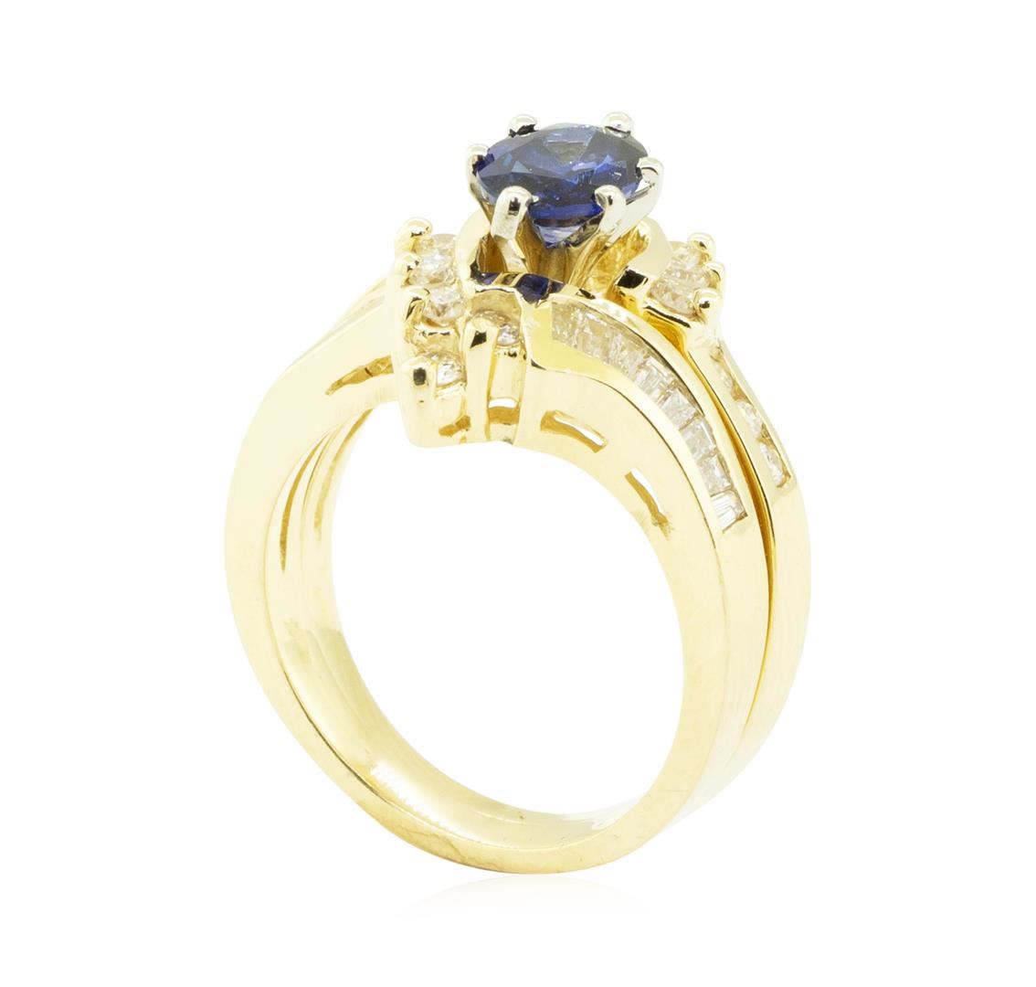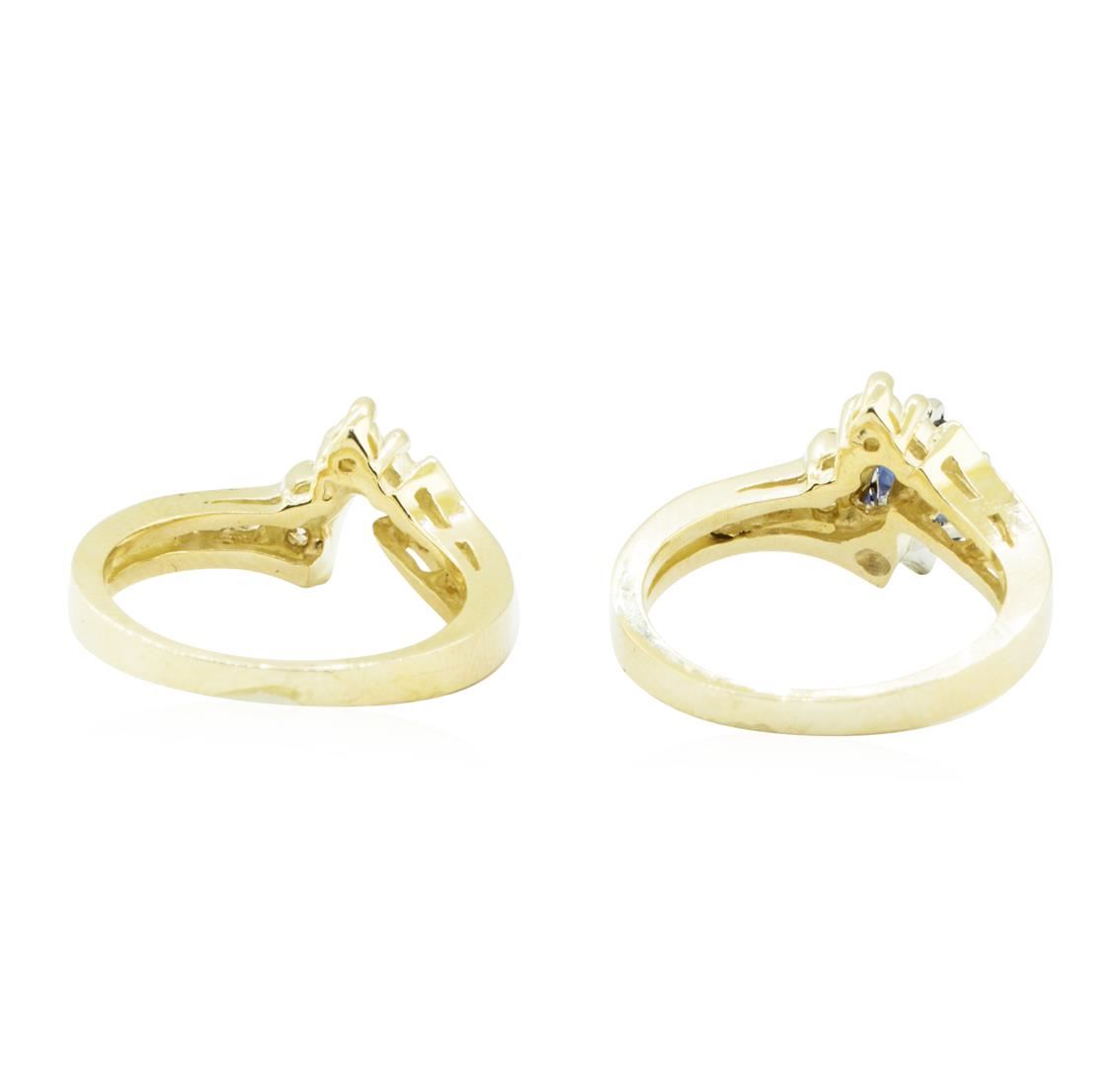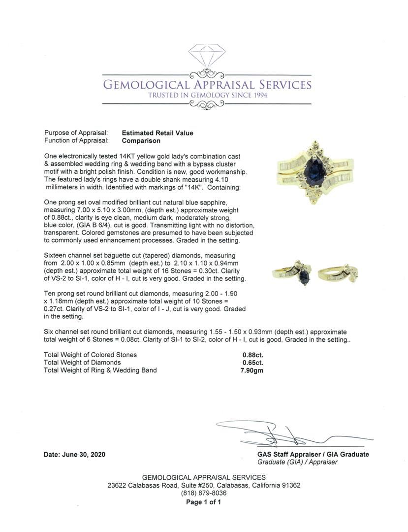 One electronically tested 14KT yellow gold lady's combination cast & assembled wedding ring & wedding band with a bypass cluster motif with a bright polish finish. The featured lady's rings have a double shank measuring 4.10 millimeters in width. Identified with markings of '14K'. Condition is new, good workmanship. Containing: One prong set oval modified brilliant cut natural blue sapphire, measuring 7.00 x 5.10 x 3.00mm, (depth est.) approximate weight of 0.88ct., clarity is eye clean, medium dark, moderately strong, blue color, (GIA B 6/4), cut is good. Transmitting light with no distortion, transparent. Colored gemstones are presumed to have been subjected to commonly used enhancement processes. Graded in the setting. Sixteen channel set baguette cut (tapered) diamonds, measuring from 2.00 x 1.00 x 0.85mm (depth est.) to 2.10 x 1.10 x 0.94mm (depth est.) approximate total weight of 16 Stones = 0.30ct. Graded in the setting. Color H - I Clarity VS-2 to SI-1 Cut Very Good Ten prong set round brilliant cut diamonds, measuring 2.00 - 1.90 x 1.18mm (depth est.) approximate total weight of 10 Stones = 0.27ct. Graded in the setting. Color I - J Clarity VS-2 to SI-1 Cut Very Good Six channel set round brilliant cut diamonds, measuring 1.55 - 1.50 x 0.93mm (depth est.) approximate total weight of 6 Stones = 0.08ct. Graded in the setting. Color H - I Clarity SI-1 to SI-2 Cut Good. Total Weight of Colored Stones 0.88ct.. Total Weight of Diamonds 0.65ct.. Total Weight of Ring & Wedding Band 7.90gm GAS Appraised at $3500.00. GAS Appraised.
