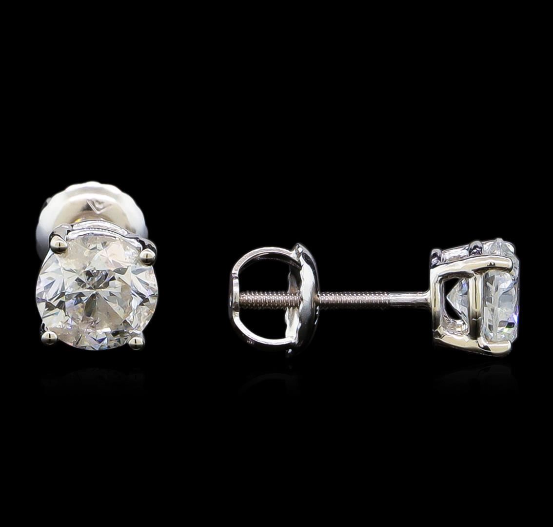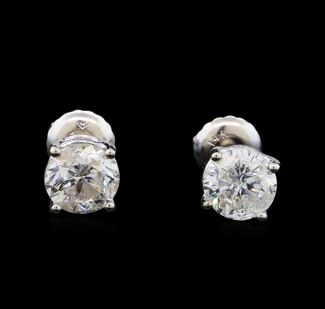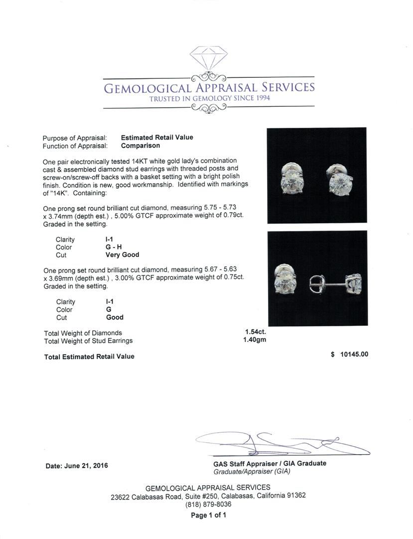 One pair electronically tested 14KT white gold lady's combination cast & assembled diamond stud earrings with threaded posts and screw-on/screw-off backs with a basket setting with a bright polish finish. Identified with markings of "14K". Condition is new, good workmanship. Containing: One prong set round brilliant cut diamond, measuring 5.75 - 5.73 x 3.74mm (depth est.) , 5.00.%. GTCF approximate weight of 0.79ct. Graded in the setting. Clarity: I-1. Color: G - Very Good One prong set round brilliant cut diamond, measuring 5.67 - 5.63 x 3.69mm (depth est.) , 3.00.%. GTCF approximate weight of 0.75ct. Graded in the setting. Clarity: I-1. Color: Good. Total Weight of Diamonds 1.54ct. Total Weight of Stud Earrings 1.40gm. GAS Appraised at $10,145.00.