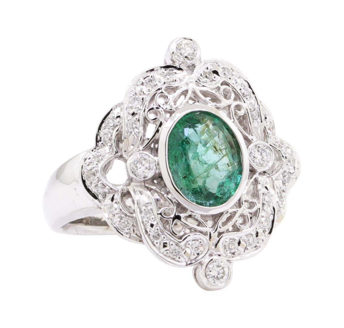 One electronically tested 14KT white gold lady's cast fashion ring with a vintage motif with a bright polish finish. The featured lady's ring has filigree detailing and a shank measuring 3.25 millimeters wide. Identified with markings of '14K'. Condition is new, good workmanship. Containing: One bezel set oval modified mixed cut natural emerald, measuring 8.60 x 6.60 x 3.85mm, (depth est.) 5%. bulge factor, approximate weight of 1.39ct., clarity is moderately included, medium, moderately strong, green color, (GIA G 5/4), cut is good. Transmitting light somewhat diffusely, transparent to translucent. Naturally occurring internal & external characteristics are present. Indications of oil residue. Colored gemstones are presumed to have been subjected to commonly used enhancement processes. Graded in the setting. Four prong set round brilliant cut diamonds, measuring 2.20 - 2.10 x 1.33mm (depth est.) approximate total weight of 4 Stones = 0.15ct. Graded in the setting. Color H - I Clarity VS-2 to SI-1 Cut Good Thirty prong set round brilliant cut diamonds, measuring 1.20 - 1.10 x 0.69mm (depth est.) approximate total weight of 30 Stones = 0.14ct. Graded in the setting. Color H - I Clarity VS-2 to SI-1 Cut Good. Total Weight of Colored Stones 1.39ct.. Total Weight of Diamonds 0.29ct.. Total Weight of Ring 6.60gm GAS Appraised at $2850.00. GAS Appraised.
