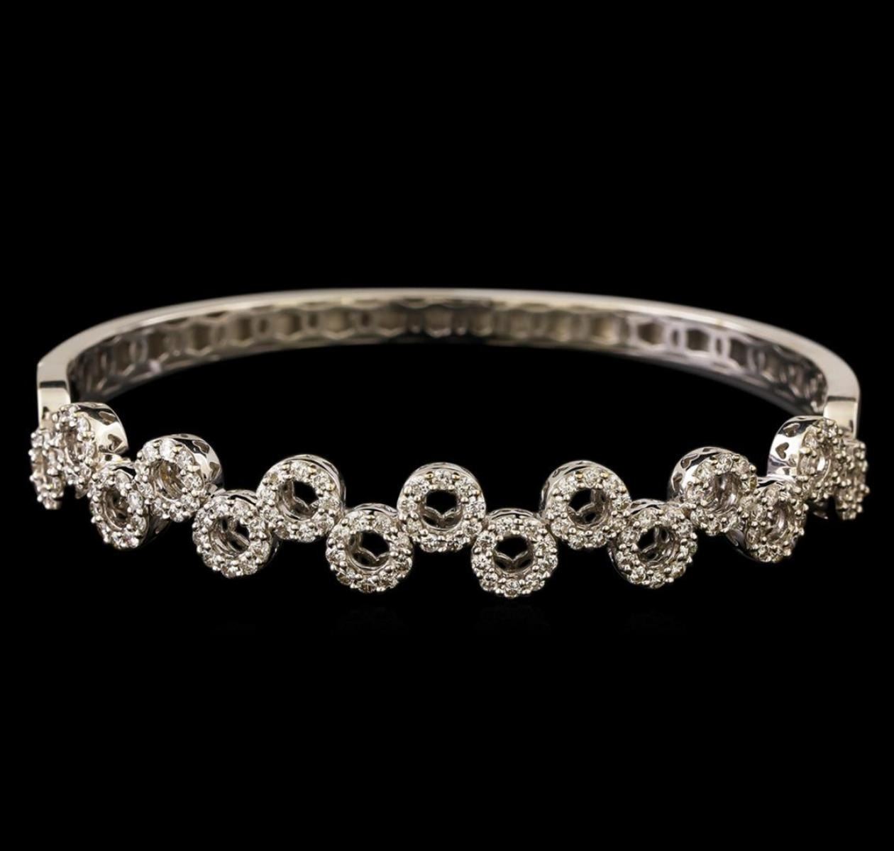 One electronically tested 18KT white gold ladies cast & assembled diamond bangle bracelet. Six and three-quarter inch wearable length oval shaped bangle bracelet features a curvature of interlocking diamond bezels supported by hinged shoulders, terminating in a concealed push clasp. Bright polish finish. Identified with markings of '18K 750'. Condition is good. Containing: One Hundred Thirty-Five prong set round brilliant cut diamonds, measuring 1.50 - 1.40 x 0.87mm (depth est.) approximate total weight of 135 Stones = 1.55ct. Graded in the setting. Clarity SI-2 to I-1. Color: G - I. Total Weight of Diamonds 1.55ct.. Total Weight of Bangle Bracelet 20.23gm. AIG Appraised.