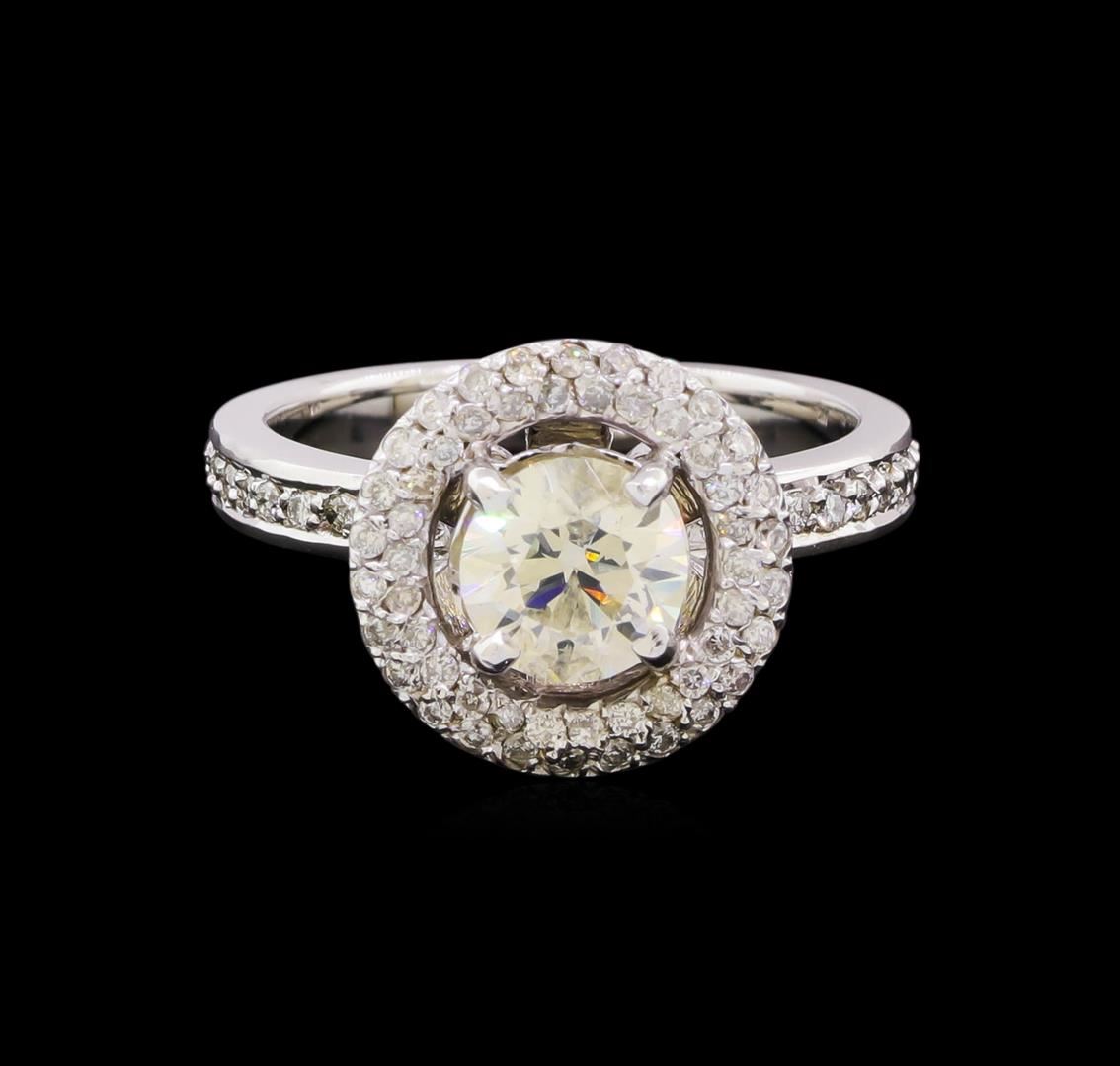 One electronically tested 14KT white gold lady's cast wedding ring with a basket halo with a bright polish finish. Featured lady's ring has a shank measuring 2.55 millimeters in width. Identified with markings of "14K". Condition is new, good workmanship. Containing: One prong set round brilliant cut diamond, measuring 6.26 - 6.24 x 4.00mm (depth est.) , 5.00.%. GTCF approximate weight of 1.00ct. Graded in the setting. Clarity: I-1. Color: J - K. Cut Good Forty-Two prong set round brilliant cut diamonds, measuring 1.25 - 1.10 x 0.73mm (depth est.) approximate total weight of 42 Stones = 0.27ct. Graded in the setting. Clarity: SI-1 to SI-2. Color: G - I. Cut Good Fifty-Two prong set round brilliant cut diamonds, measuring 1.20 - 1.00 x 0.68mm (depth est.) approximate total weight of 52 Stones = 0.28ct. Graded in the setting. Clarity: SI-1 to I-1. Color: H - I. Cut Good. Total Weight of Diamonds 1.55ct. Total Weight of Ring 5.60gm. GAS Appraised.