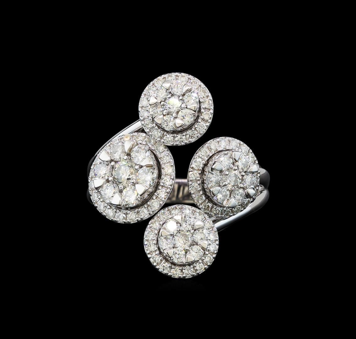 One electronically tested 14KT white gold lady's combination cast & assembled fashion ring with a split shank with a bright polish finish. The featured lady's ring has four circular diamond clusters and a shank measuring 2.91 millimeters wide. Identified with markings of '585'. Condition is new, good workmanship. Containing: One prong set round brilliant cut diamond, measuring 3.45 - 3.40 x 2.13mm (depth est.) approximate weight of 0.15ct. Graded in the setting. Clarity SI-1. Color: I - J Cut Very Good Eight prong set round brilliant cut diamonds, measuring 2.40 - 2.35 x 1.45mm (depth est.) approximate total weight of 8 Stones = 0.40ct. Graded in the setting. Clarity SI-1 to I-1. Color: H - J Cut Good One prong set round brilliant cut diamond, measuring 2.70 - 2.65 x 1.61mm (depth est.) approximate weight of 0.07ct. Graded in the setting. Clarity SI-2. Color: H Cut Good Six prong set round brilliant cut diamonds, measuring 2.00 - 1.90 x 1.17mm (depth est.) approximate total weight of 6 Stones = 0.16ct. Graded in the setting. Clarity SI-1 to SI-2. Color: H - I Cut Good Twelve prong set round brilliant cut diamonds, measuring 1.80 - 1.70 x 1.07mm (depth est.) approximate total weight of 12 Stones = 0.24ct. Graded in the setting. Clarity SI-1 to SI-2. Color: H - I Cut Good Seventy prong set round brilliant cut diamonds, measuring 1.30 - 1.20 x 0.78mm (depth est.) approximate total weight of 70 Stones = 0.53ct. Graded in the setting. Clarity SI-1 to SI-2. Color: H - I Cut Good. Total Weight of Diamonds 1.55ct.. Total Weight of Ring 7.90gm. GAS Appraised.