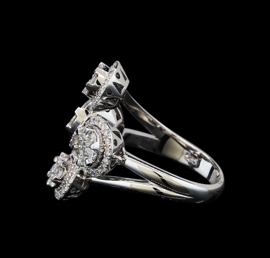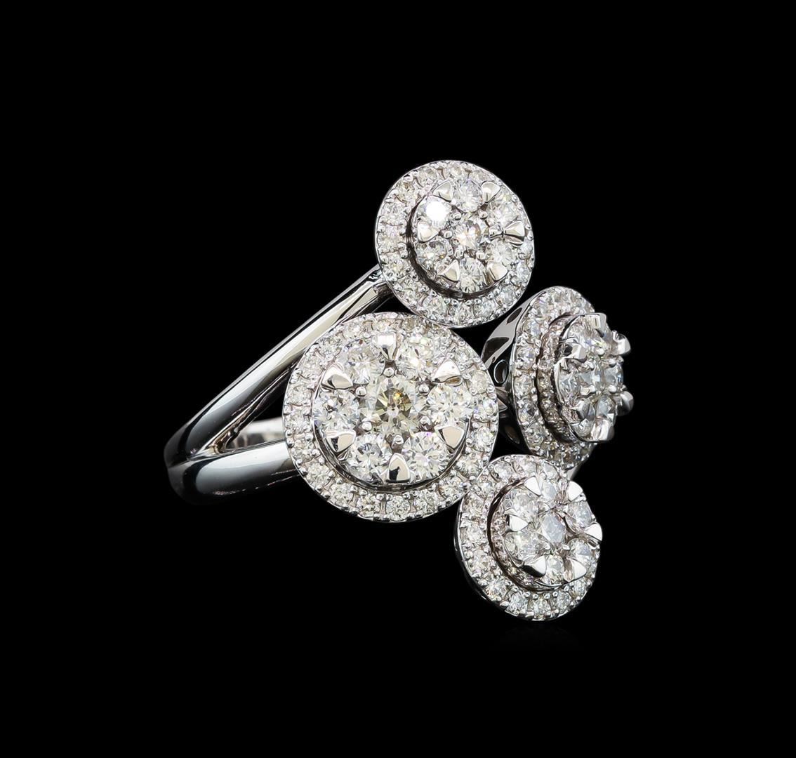 One electronically tested 14KT white gold lady's combination cast & assembled fashion ring with a split shank with a bright polish finish. The featured lady's ring has four circular diamond clusters and a shank measuring 2.91 millimeters wide. Identified with markings of '585'. Condition is new, good workmanship. Containing: One prong set round brilliant cut diamond, measuring 3.45 - 3.40 x 2.13mm (depth est.) approximate weight of 0.15ct. Graded in the setting. Clarity SI-1. Color: I - J Cut Very Good Eight prong set round brilliant cut diamonds, measuring 2.40 - 2.35 x 1.45mm (depth est.) approximate total weight of 8 Stones = 0.40ct. Graded in the setting. Clarity SI-1 to I-1. Color: H - J Cut Good One prong set round brilliant cut diamond, measuring 2.70 - 2.65 x 1.61mm (depth est.) approximate weight of 0.07ct. Graded in the setting. Clarity SI-2. Color: H Cut Good Six prong set round brilliant cut diamonds, measuring 2.00 - 1.90 x 1.17mm (depth est.) approximate total weight of 6 Stones = 0.16ct. Graded in the setting. Clarity SI-1 to SI-2. Color: H - I Cut Good Twelve prong set round brilliant cut diamonds, measuring 1.80 - 1.70 x 1.07mm (depth est.) approximate total weight of 12 Stones = 0.24ct. Graded in the setting. Clarity SI-1 to SI-2. Color: H - I Cut Good Seventy prong set round brilliant cut diamonds, measuring 1.30 - 1.20 x 0.78mm (depth est.) approximate total weight of 70 Stones = 0.53ct. Graded in the setting. Clarity SI-1 to SI-2. Color: H - I Cut Good. Total Weight of Diamonds 1.55ct.. Total Weight of Ring 7.90gm. GAS Appraised.