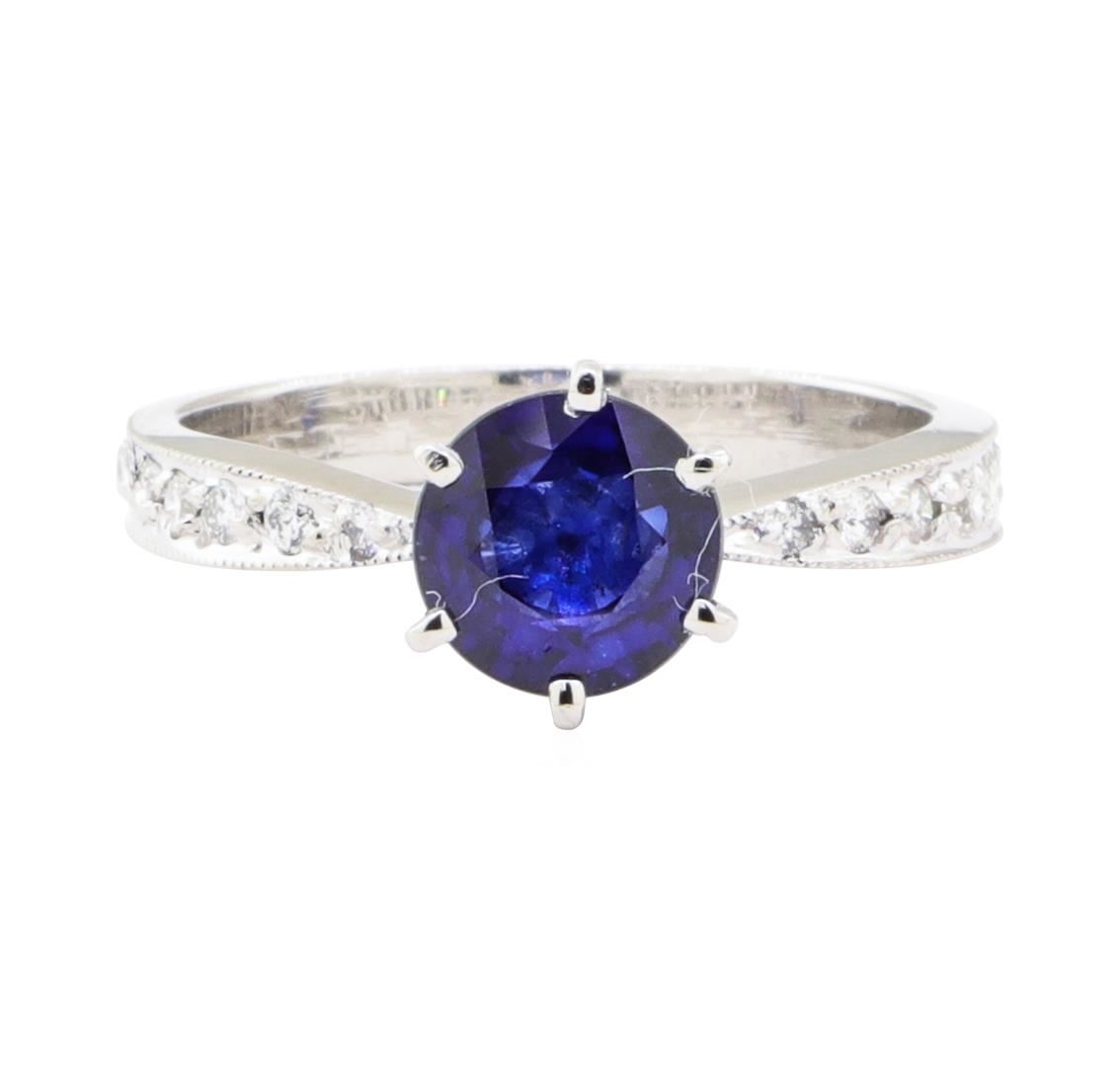 One electronically tested platinum lady's combination cast & assembled fashion ring with a pinched cathedral shank with a bright polish with milgrain detailing finish. The featured lady's ring has a shank measuring 2.50 millimeters wide. Identified with markings of 'Platinum'. Condition is new, good workmanship. Containing: One prong set round modified mixed cut natural blue sapphire, measuring 6.76 - 6.72 x 3.80 mm, (depth est.) approximate weight of 1.35ct., clarity is slightly included, dark, moderately strong, blue color, (GIA B 7/4), cut is very good. Transmitting light with a minimum of distortion, transparent. Colored gemstones are presumed to have been subjected to commonly used enhancement processes. Graded in the setting. Fourteen bead set round brilliant cut diamonds, measuring 1.70 - 1.40 x 0.96mm (depth est.) approximate total weight of 14 Stones = 0.20ct. Graded in the setting. Color H - I Clarity VS-2 to SI-1 Cut Good. Total Weight of Colored Stones 1.35ct.. Total Weight of Diamonds 0.20ct.. Total Weight of Ring 4.70gm GAS Appraised at $2475.00. GAS Appraised.